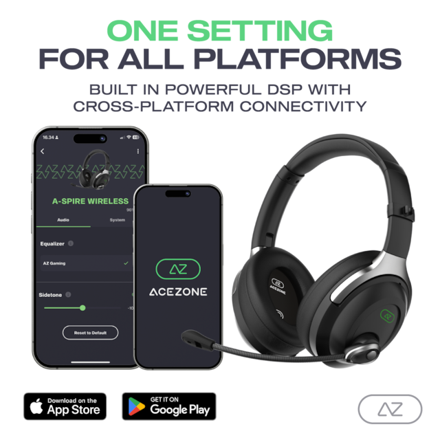 Last ned AceZone Mobil App for å utforske forskjellige innstillinger og skreddersy din lydopplevelse. Opplev de mange måtene du kan tilpasse og gjøre din gaming-lyd perfekt, med innstillinger for dem som bruker briller. Den kraftfulle integrerte DSP gjør det mulig å lagre EQ-innstillinger direkte i headsettet, uansett hvilken plattform du spiller på. Du trenger ikke installere programvare på PC-en din, da alle innstillinger styres gjennom mobilappen.