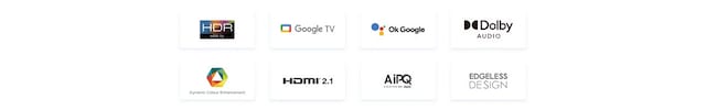 HDR 10, Google TV, Ok Google, Dolby Audio, Dynamic Color Enhancement, HDMI 2.1, AIPQ2.0, EDGELESS DESIGN