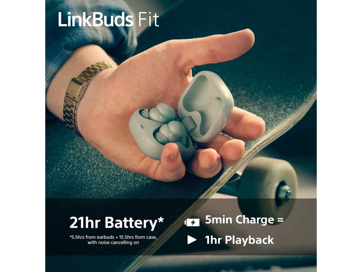 Med en bemerkelsesverdig total avspillingstid på 21 timer gir LinkBuds Fit uavbrutt musikk dagen lang.
