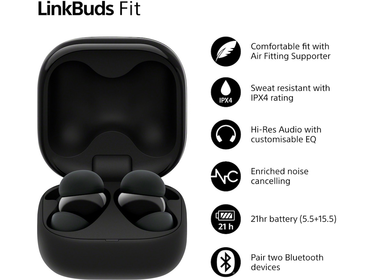 LinkBuds Fit gir stabilitet og komfort. Den smarte air fitting supporteren sørger for en sikker passform, og med lav vekt på kun 4,8 g per ørepropp kan de brukes lenge uten ubehag. Med IPX4-klassifisering tåler de både svette og regn – ideelt for både innendørs og utendørs bruk.