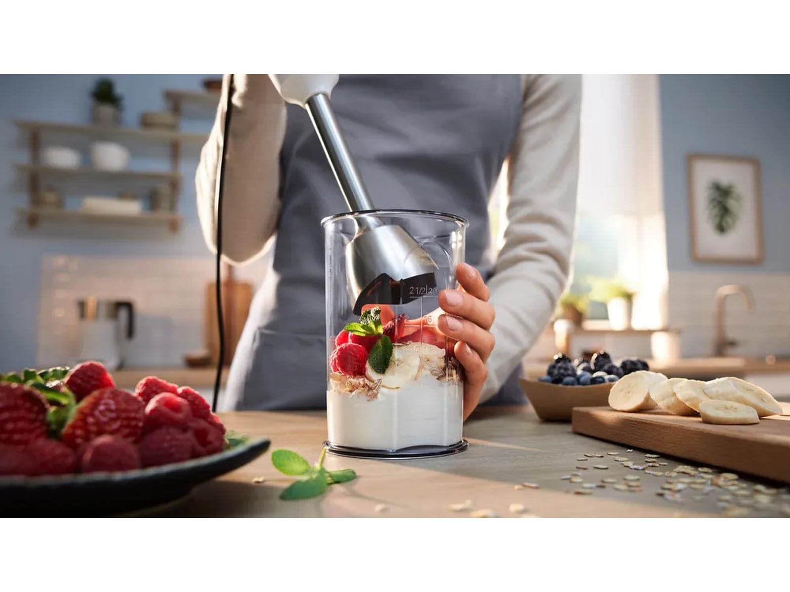 Gled deg over perfekte resultater uten spruting og søl. AntiSplash- teknologien forhindrer spruting under bruk. Klokkedesign sikrer effektiv blanding og ett kjøkken uten søl.