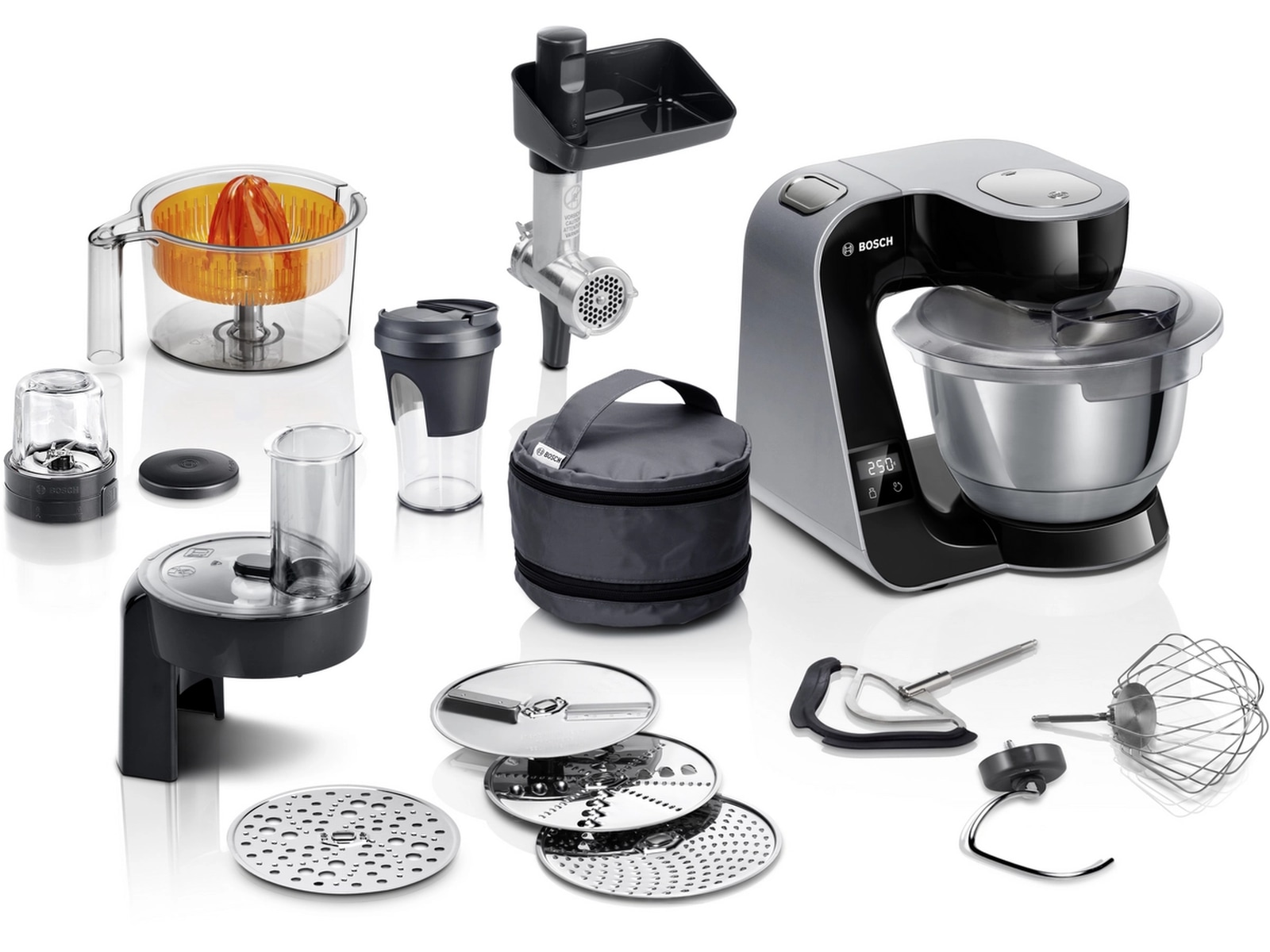 Det hendige foodprosessortilbehøret er utstyrt med 4 vendbare skiver for skjæring og riving av både fint og grovt. Det følger også med en kjøttkvern, sitruspresse, minimikser på 0,5, minihakker og et gjennomsiktig lokk med påfyllingshull. Med den tilhørende mørkegrå tilbehørsposen kan bakverket enkelt oppbevares i skålen til kjøkkenmaskinen. Alt tilbehør kan vaskes i maskin for enkel rengjøring.