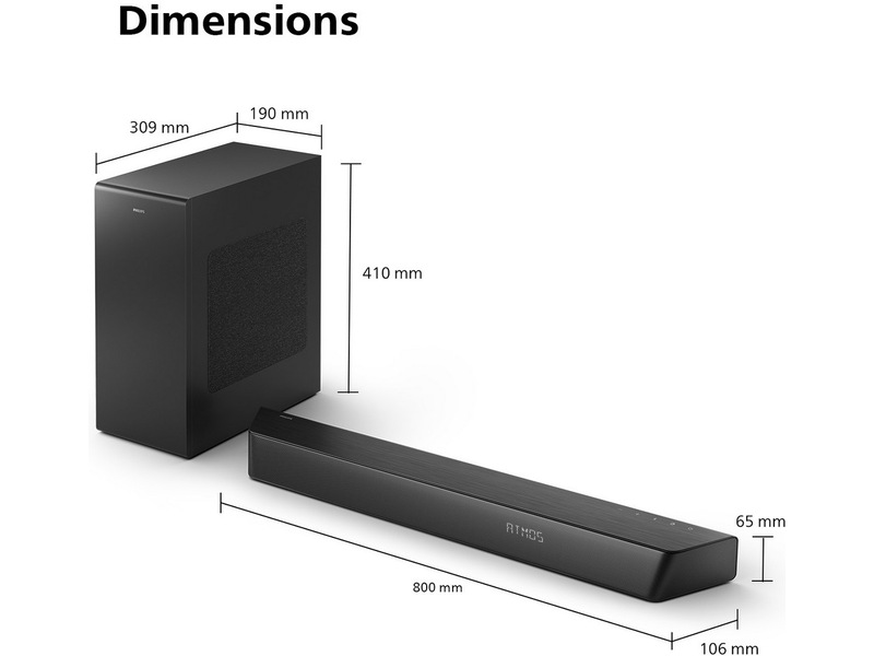 Dimensjoner (BxDxH) / vektdetaljer Subwoofer: 19 cm x 30.9 cm x 41 cm / 6 kg, Lydbjelke: 80 cm x 10.6 cm x 6.5 cm / 2.5 kg