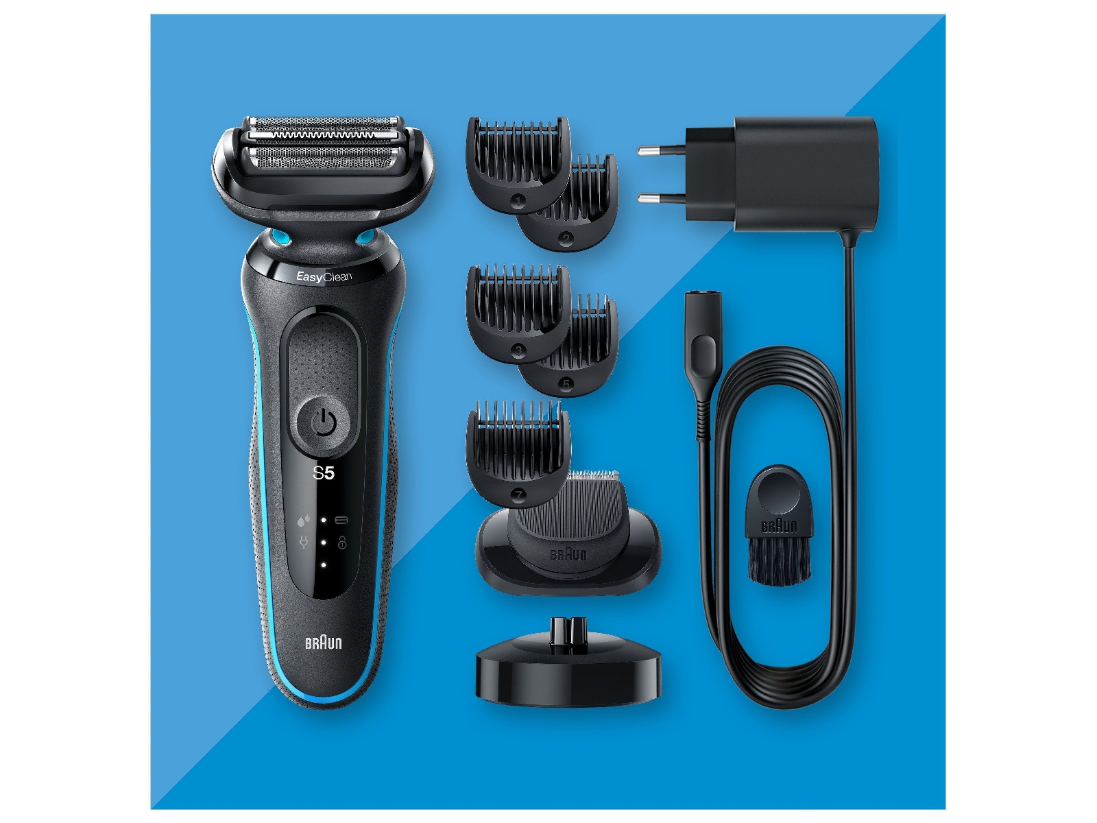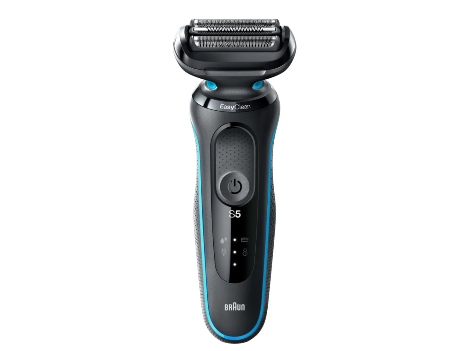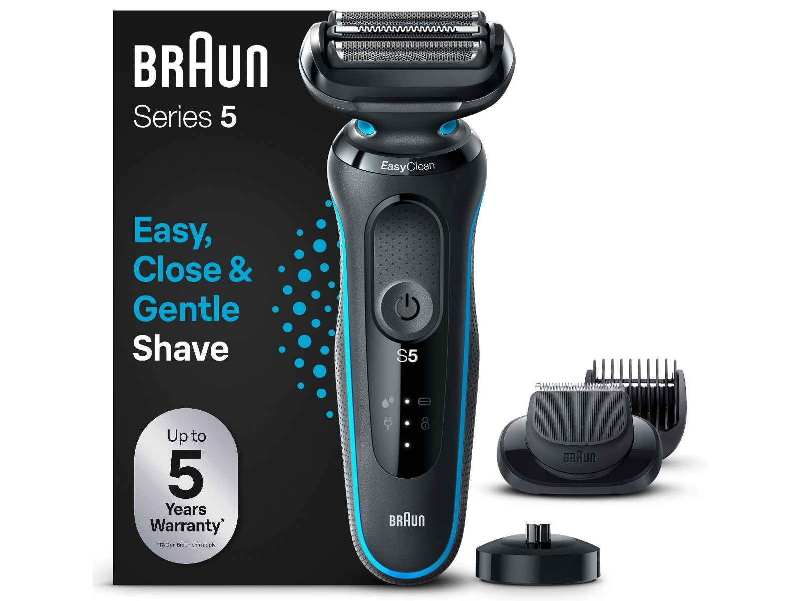 Braun Series 5 elektrisk barbermaskin for menn har 3 fleksible blader som tilpasser seg ansiktets konturer og gir deg en bekvem barbering. EasyClean-systemet gjør at maskinen raskt og enkelt kan rengjøres uten å ta av barberhodet. Li-ion-batteriet gir inntil 3 uker med barbering og en 5 minutters hurtiglading. Barberhøvelen er 100 % vanntett og kan brukes til både våt og tørr barbering. Kompatibel med EasyClick for å oppgradere barbermaskinen.