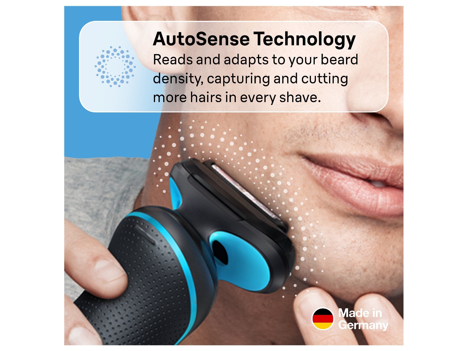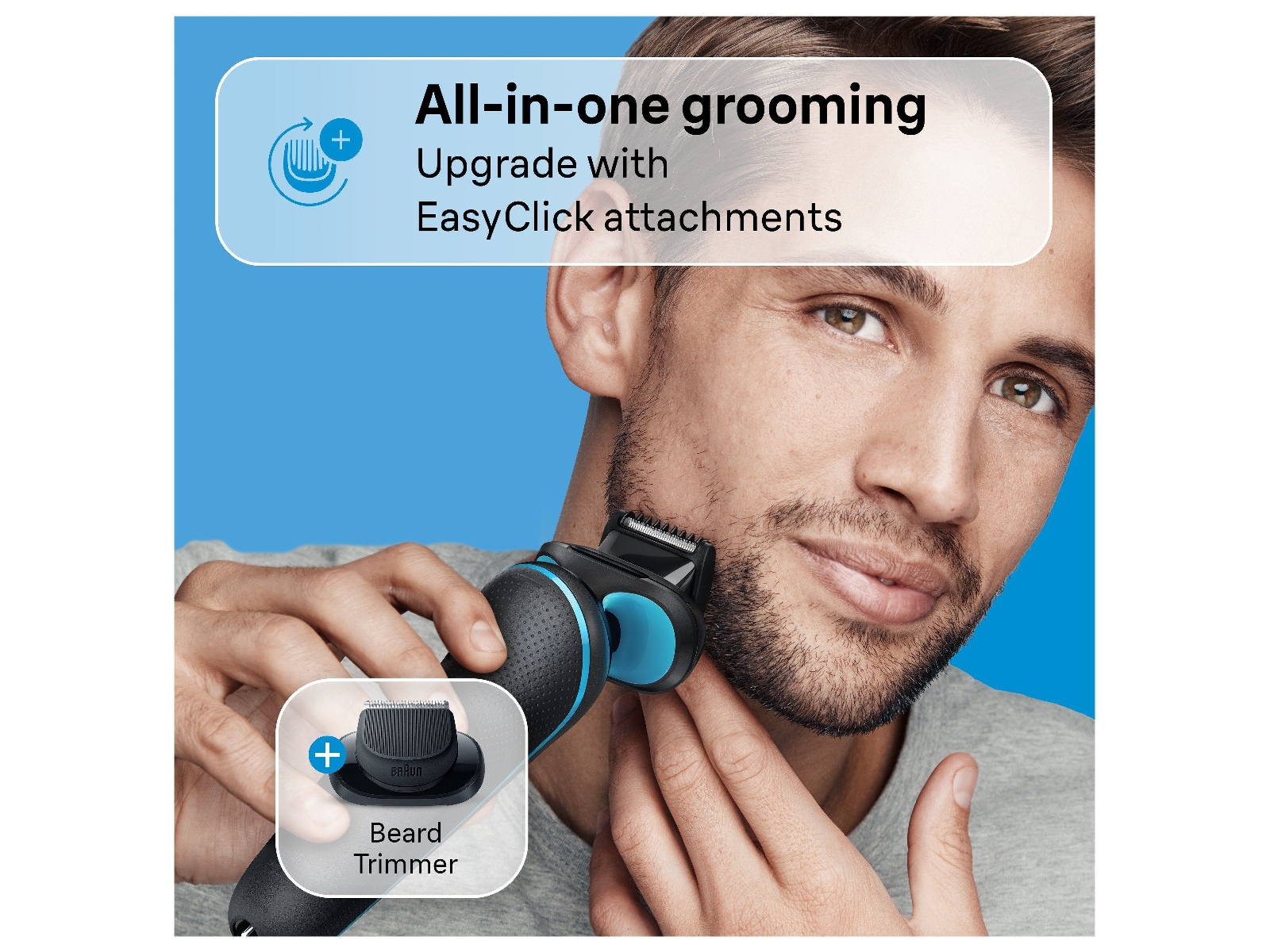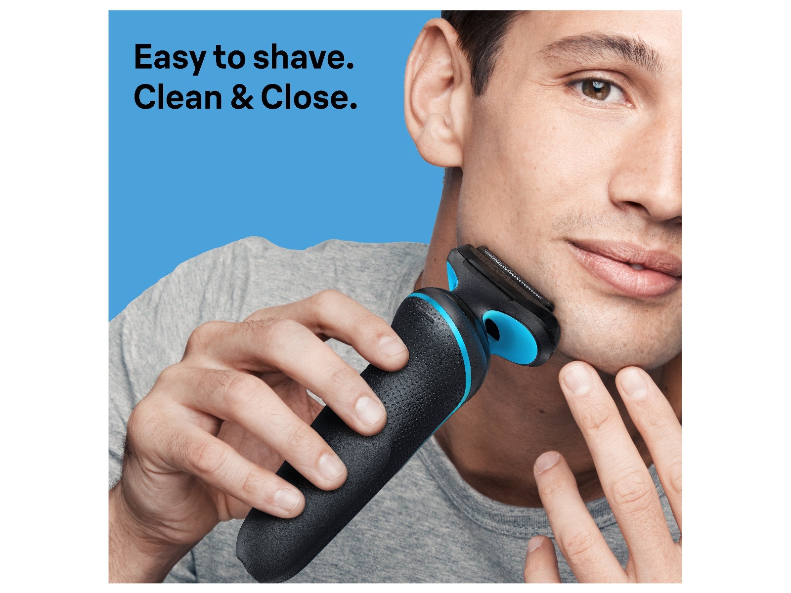 Braun Series 5 elektrisk barbermaskin for menn har 3 fleksible blader som tilpasser seg ansiktets konturer og gir deg en bekvem barbering. EasyClean-systemet gjør at maskinen raskt og enkelt kan rengjøres uten å ta av barberhodet. Li-ion-batteriet gir inntil 3 uker med barbering og en 5 minutters hurtiglading. Barberhøvelen er 100 % vanntett og kan brukes til både våt og tørr barbering. Kompatibel med EasyClick for å oppgradere barbermaskinen.