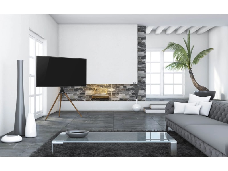 Gulvstativet har en VESA-standard på opptil 600x400 mm og passer til TV-modeller fra 32 til 65 tommer med en maksimal vekt på 35 kg. De solide trebeina har spesielle endebeskyttere som forhindrer at stativet sklir rundt og er skånsomme mot gulvet. For å gjøre monteringen enkel og smidig følger det med et monteringssett med skruer i forskjellige størrelser og en bruksanvisning.