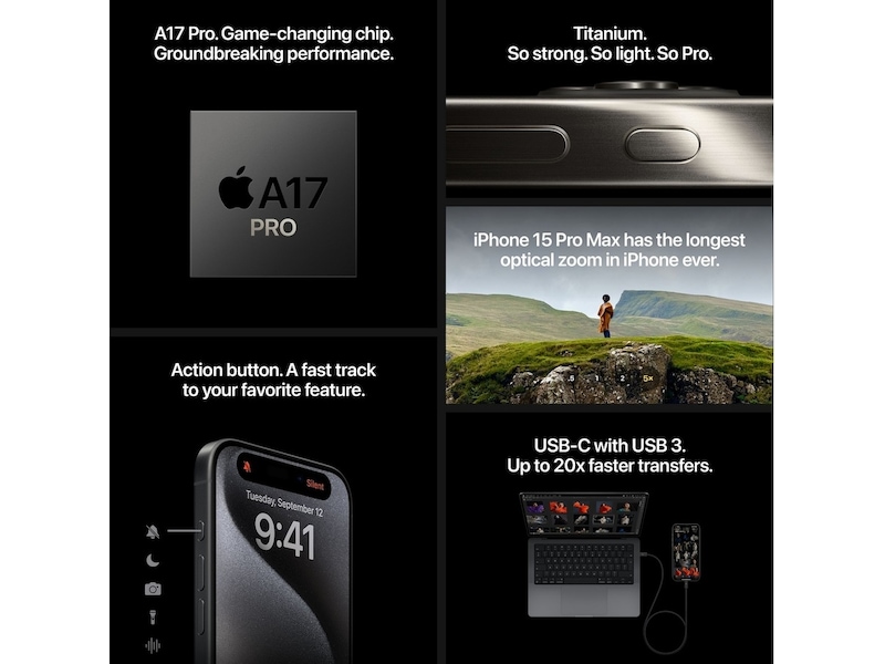 iPhone 15 Pro. Støpt i titan, og har den banebrytende A17 Pro-chipen, en handlingsknapp som kan tilpasses, og et Pro-kamerasystem med flere muligheter.
