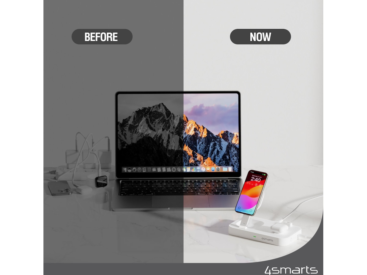 Vår MagSafe ladestasjon leverer maksimal kraft til tre enheter samtidig. Den leveres med en kraftig 30W strømadapter og USB-C-kabel for å sikre rask og effektiv lading. Denne komplette løsningen sparer deg for å måtte kjøpe en ekstra adapter. Slik kan du lade enhetene dine rett ut av boksen.