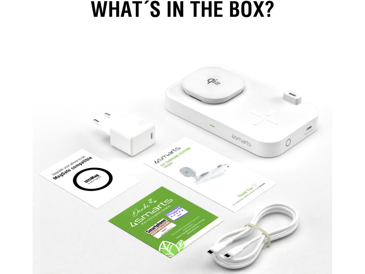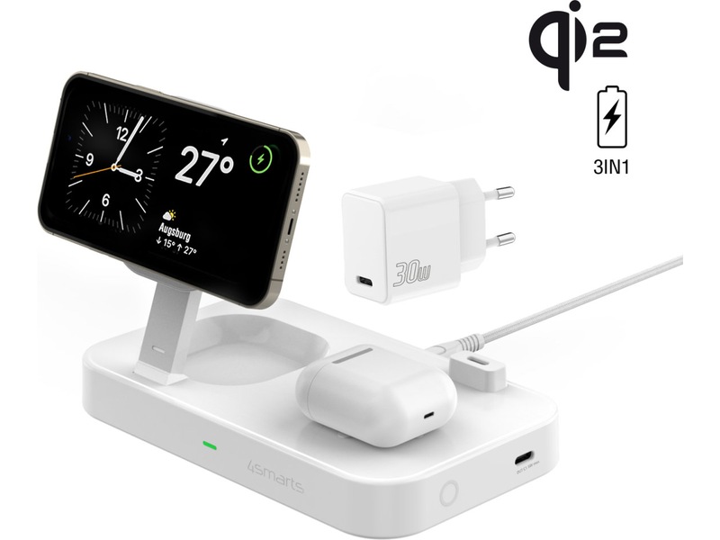 Velkommen til vår nye Qi2-lader for trådløs lading! Den tilbyr mer kraft og effektivitet takket være Qi2-standarden. MagSafe-teknologi med sterke magneter holder mobiltelefonen din sikkert og plasserer den presist for rask lading. Den medfølgende UltiMag-ringen gjør også mobiltelefoner uten MagSafe/Qi2 brukbare. Vår stasjon er kompatibel med de nyeste iPhone-modellene. For andre mobiltelefoner, sjekk kompatibilitet på produsentens nettsted.