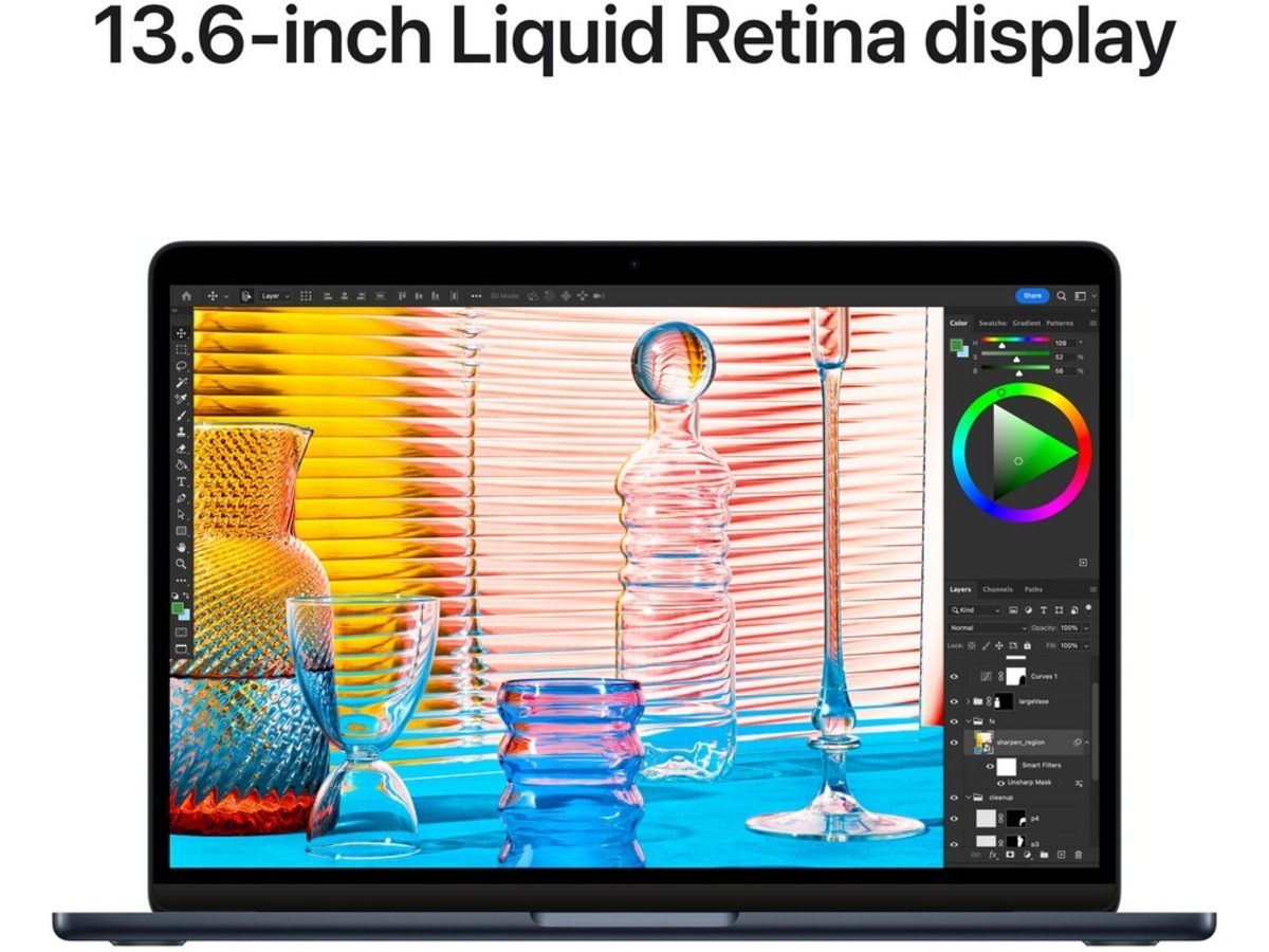• 13,6-tommers Liquid Retina-skjerm med lysstyrke på 500 nit og stort fargerom (P3) gir sterke farger og et utrolig detaljnivå3