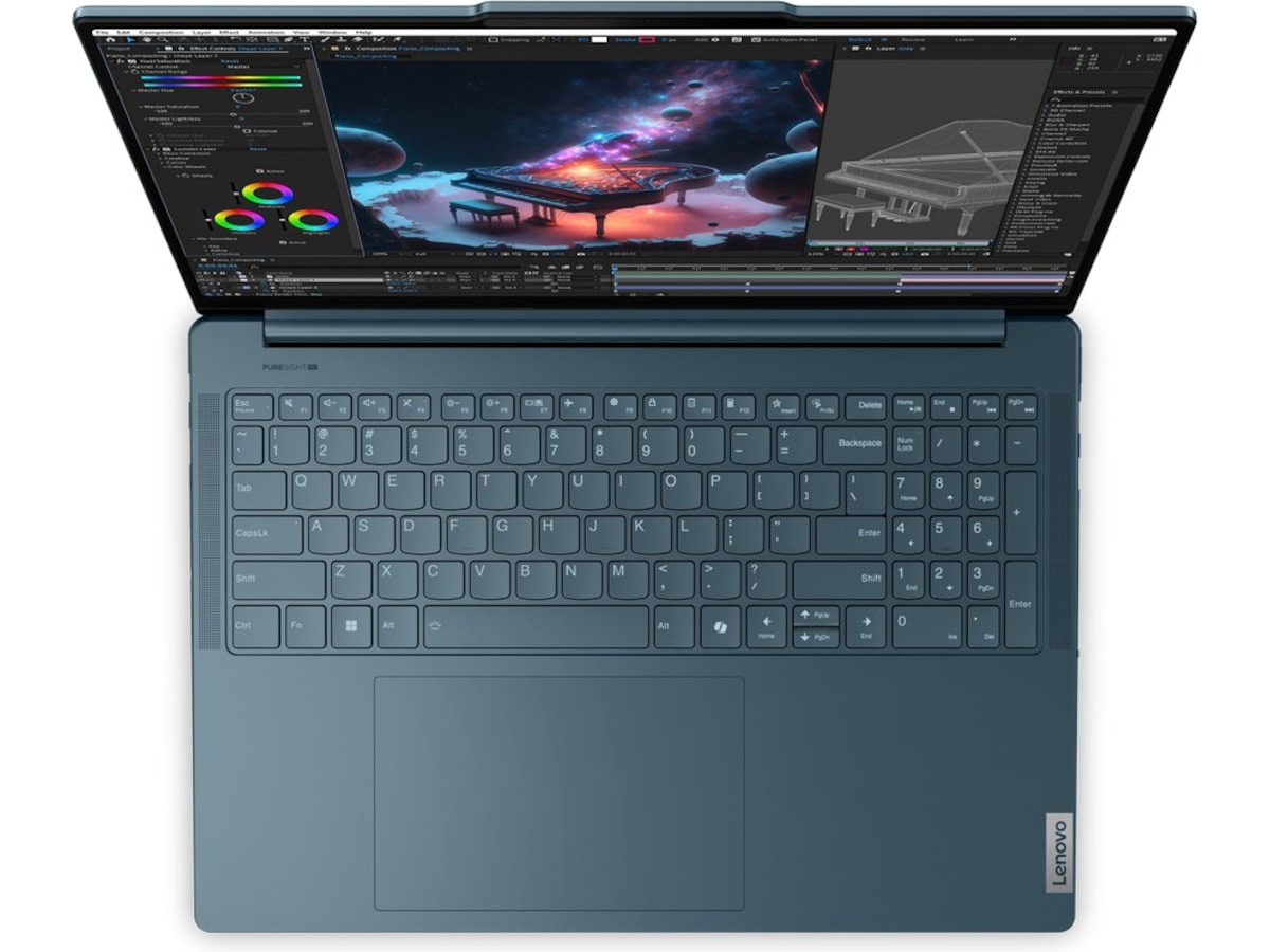 I den tynne Yoga Pro 9i bærbare kan du få plass til ditt drømmestudio. Det elegante chassiset har avrundede kanter som passer til håndens naturlige kurver. Du kan gjøre et fasjonabelt fargevalg, enten i elegant Lunar Grey eller naturinspirert Tidal Teal. Den har også alle tilkoblingsmulighetene du trenger for å organisere skrivebordet ditt på en helt ny måte: utvide lagringsplassen med SD-kortleseren, koble til skjermer via HDMI eller overfør bilder og videoer med Intel® Thunderbolt™ 4.0. Og med et batteri med høy kapasitet som lades opp på et blunk med Rapid Charge Express, går du aldri tom for strøm.