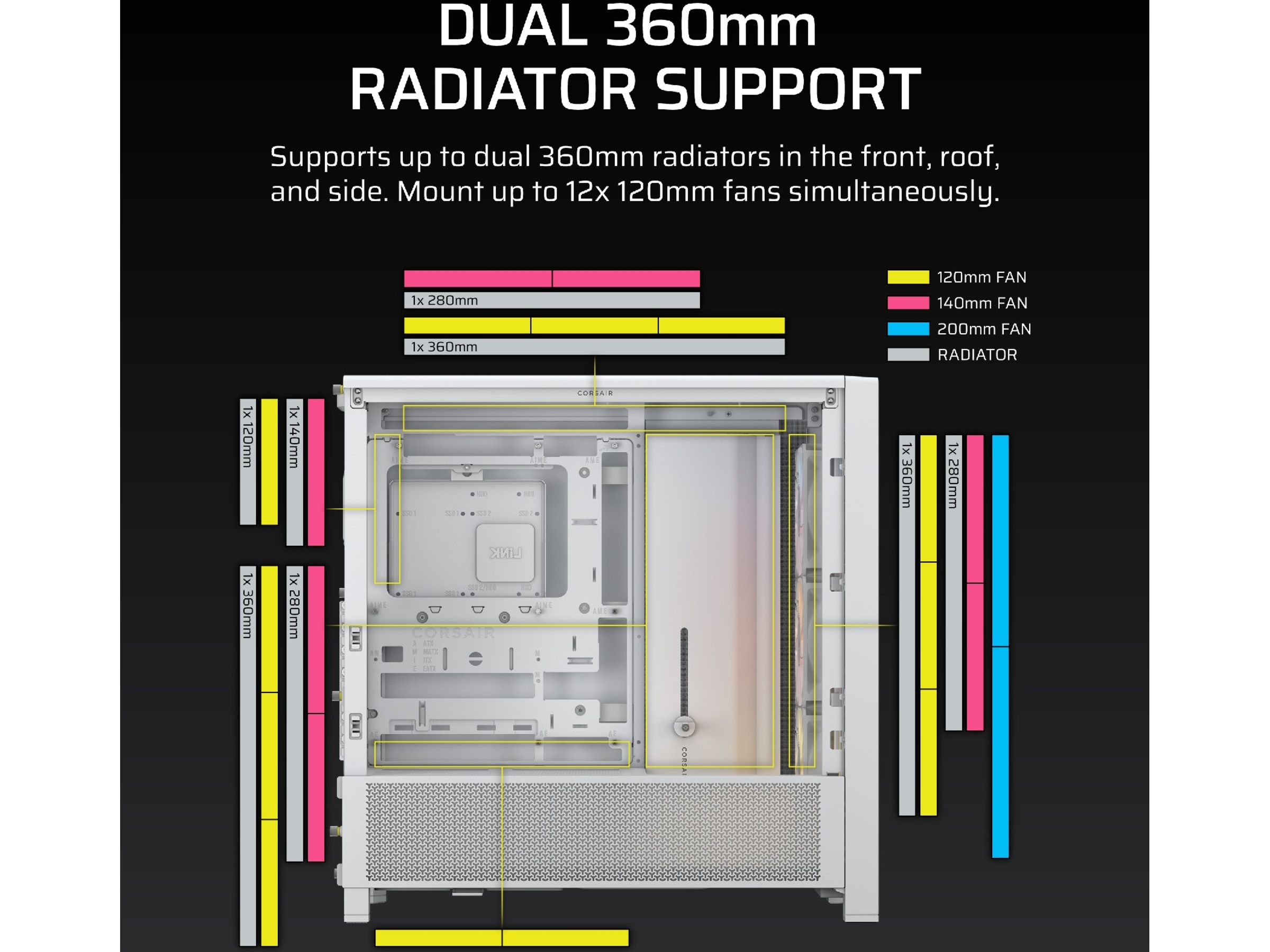 Ta kjølingen til neste nivå med tre monteringsplasseringer for 360 mm radiatorer (front, tak og side). Monter opptil 12x 120 mm vifter samtidig for å holde kjølig luft strømme inn og varm luft slippe ut raskt og effektivt.