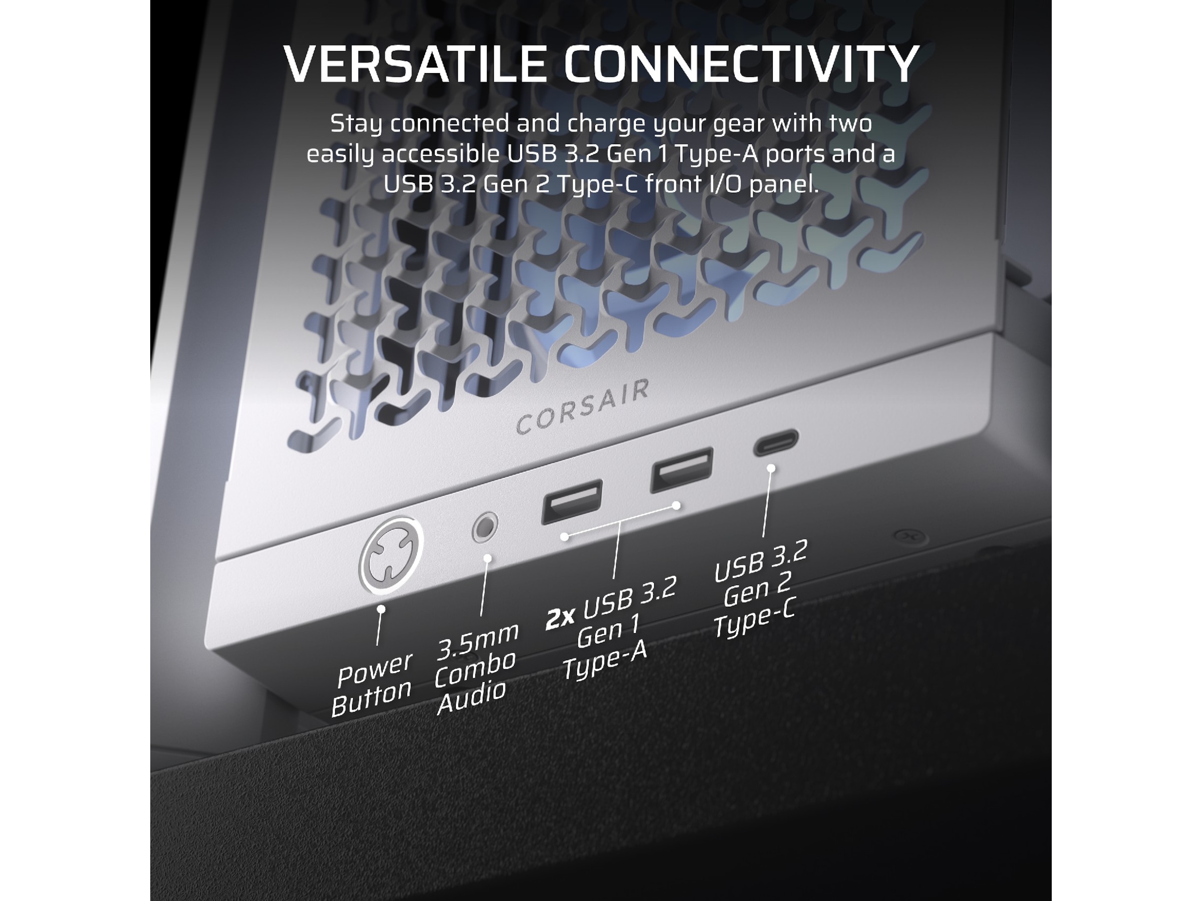 Hold deg tilkoblet og lad utstyret ditt med to lett tilgjengelige USB 3.2 Gen 1 Type-A-porter og en USB 3.2 Gen 2 Type-C front I/O-panel. Ønsker du forskjellige forbindelser? Bedre hastighet? Annen layout? I/O-panelet kan enkelt byttes ut med oppgraderinger tilgjengelig på corsair.com.
