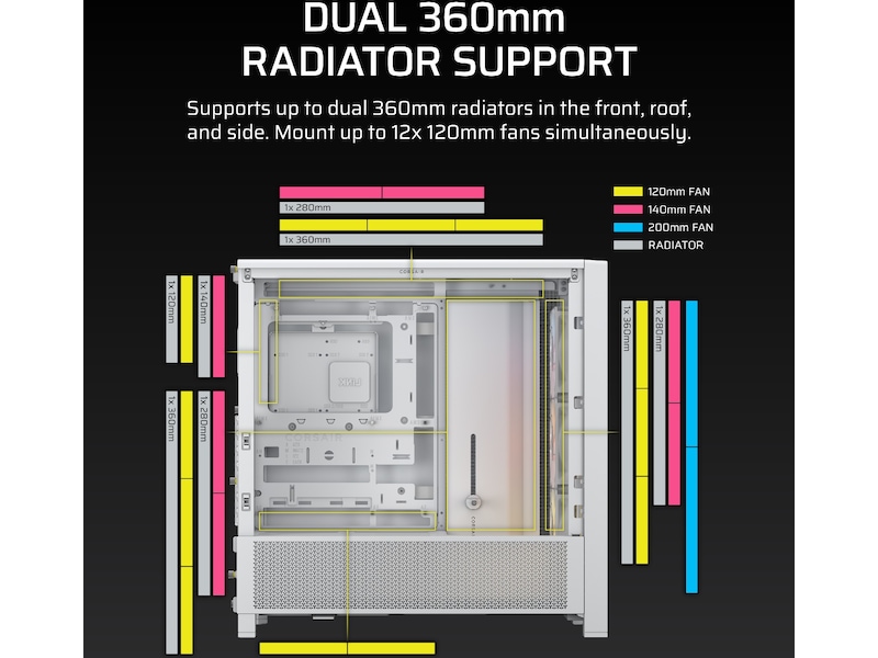 Ta kjølingen til neste nivå med tre monteringsplasseringer for 360 mm radiatorer (front, tak og side). Monter opptil 12x 120 mm vifter samtidig for å holde kjølig luft strømme inn og varm luft slippe ut raskt og effektivt.