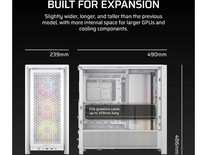 Hold deg tilkoblet og lad utstyret ditt med to lett tilgjengelige USB 3.2 Gen 1 Type-A-porter og en USB 3.2 Gen 2 Type-C front I/O-panel. Ønsker du forskjellige forbindelser? Bedre hastighet? Annen layout? I/O-panelet kan enkelt byttes ut med oppgraderinger tilgjengelig på corsair.com.