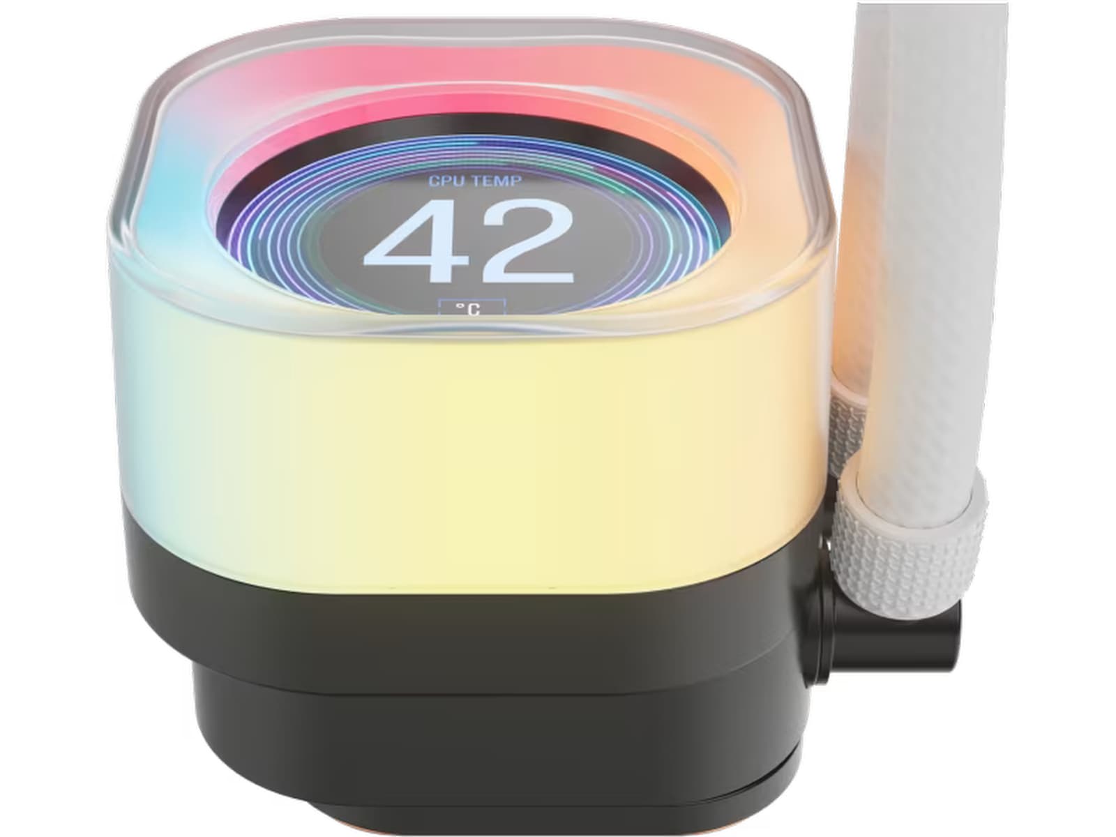 TITAN RX LCDs unike pumpehettedesign viser frem belysningen fra 44 individuelt adresserbare RGB-lysdioder rundt pumpen.