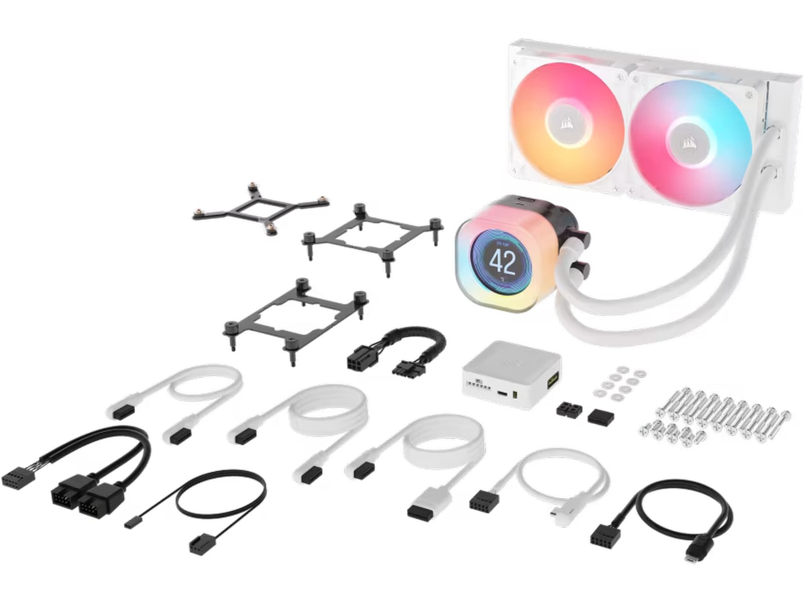 Micro USB 2.0-kabel, PCIe-strømkabel, 2 broklipskontakter, Tach-kabel, Monteringssett, iCUE Link-kabel (25 cm), USB-C-kabel (60 cm), 2 x iCUE Link-kabel (60 cm), 2 iCUE LINK RX120 RGB-vifter, USB-strømspaltekabel, iCUE Link-hub, Monteringsskruer for radiator, Vifteskruer