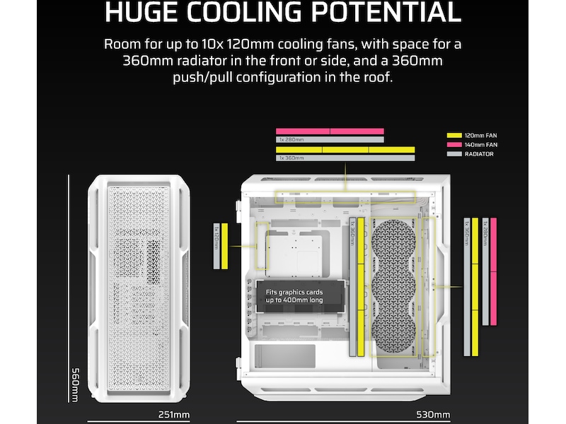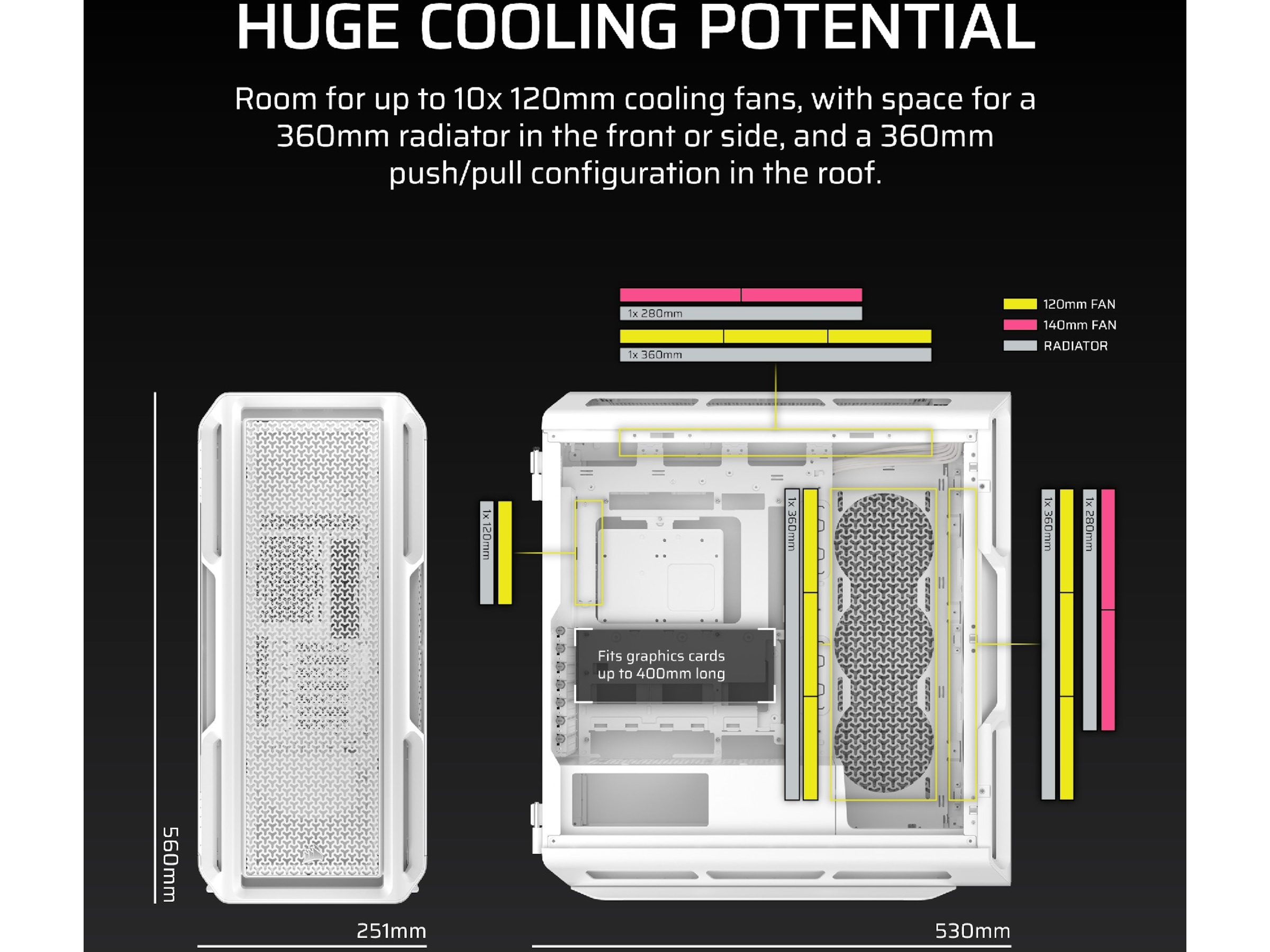 Det romslige interiøret har plass til opptil 10x 120 mm eller 4x 140 mm kjølevifter, samt flere 60 mm tykke radiatorer, inkludert opptil 360 mm foran eller på siden og en 360 mm skyv/trekk i taket .