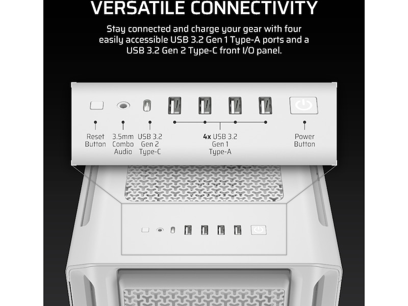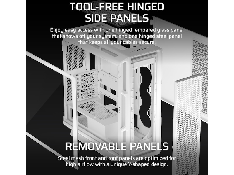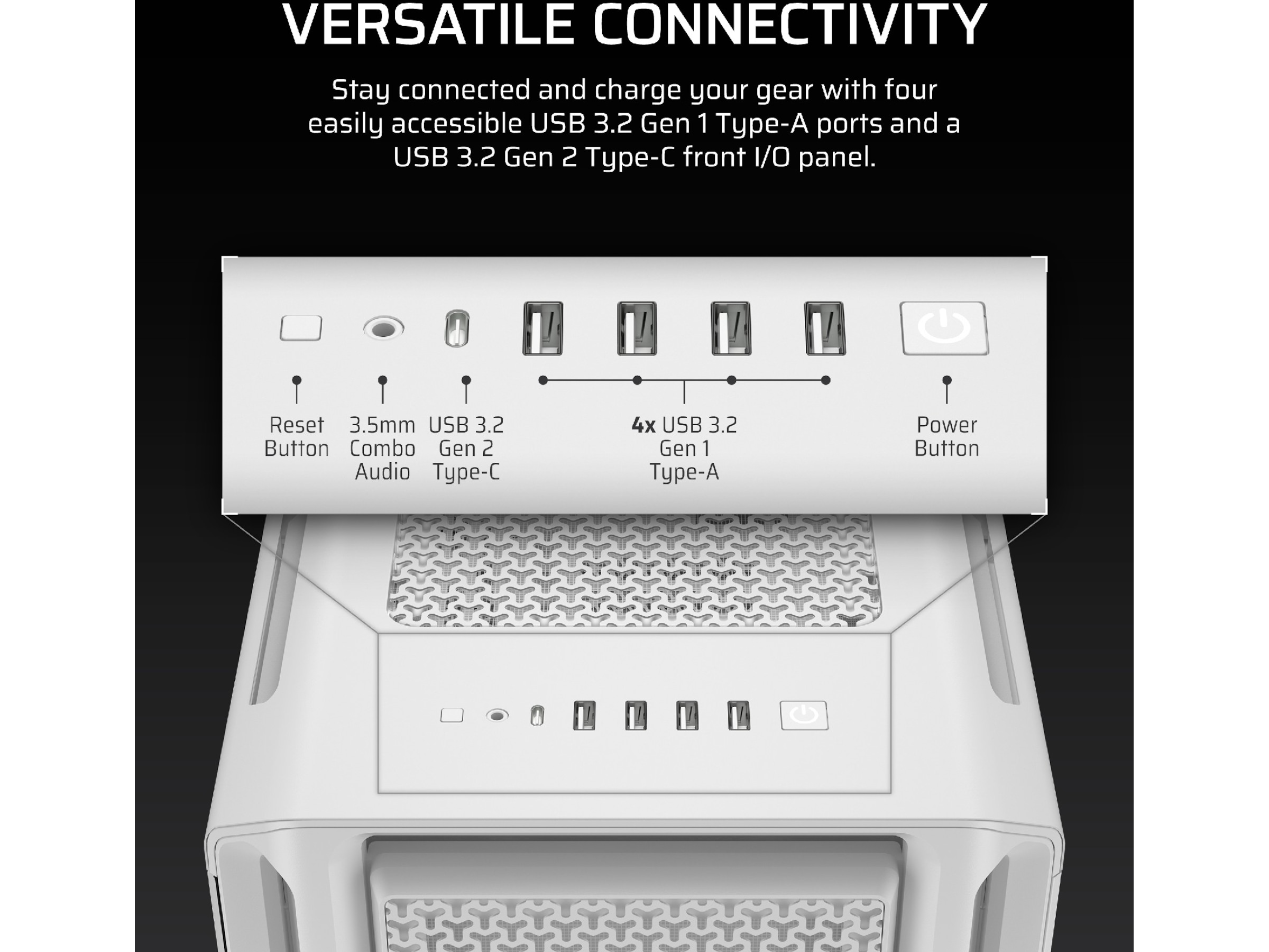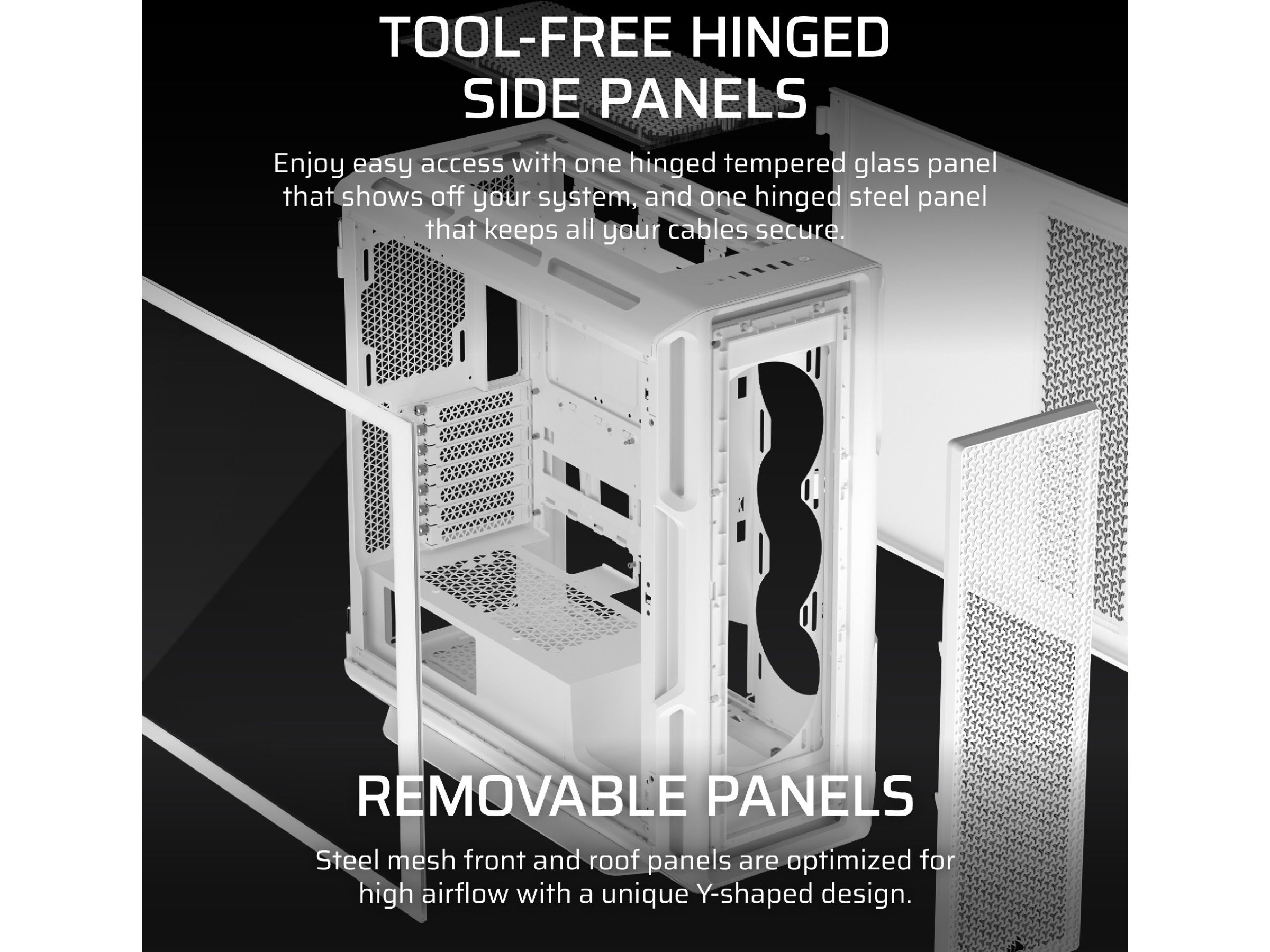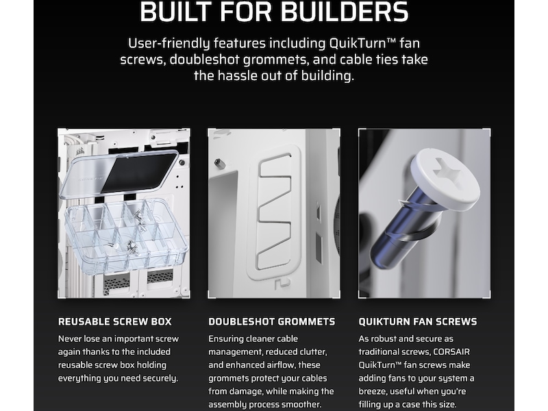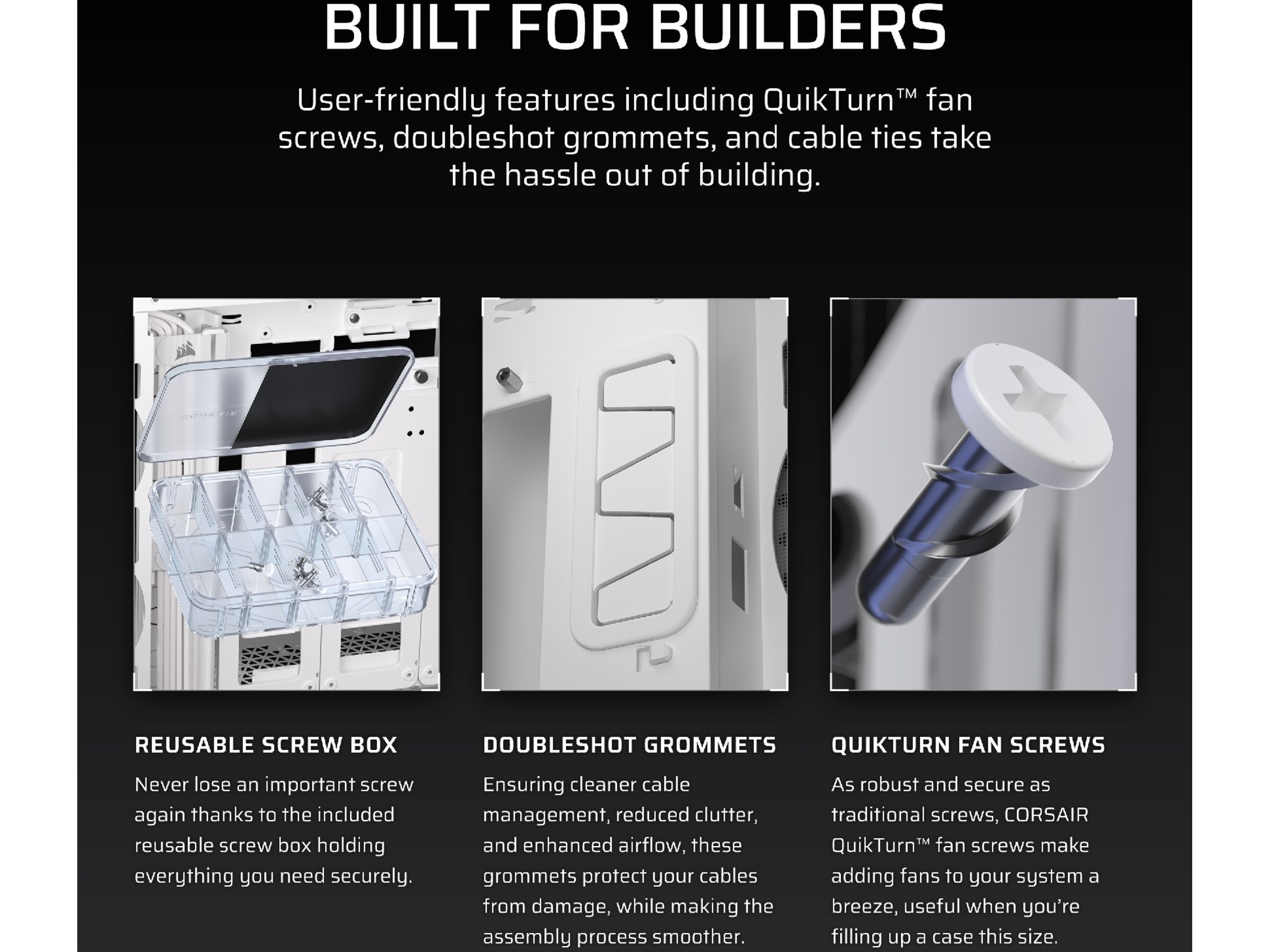 En rekke CORSAIR-innovasjoner forbedrer byggeopplevelsen, inkludert vertikal monteringsstøtte uten ekstra braketter, én-vri Quikturn-skruer, fleksible Doubleshot-hylser, integrert GPU Anti-Sag brakett, en boks for ekstra skruer, og utvendige utskjæringer for kabelhåndtering.