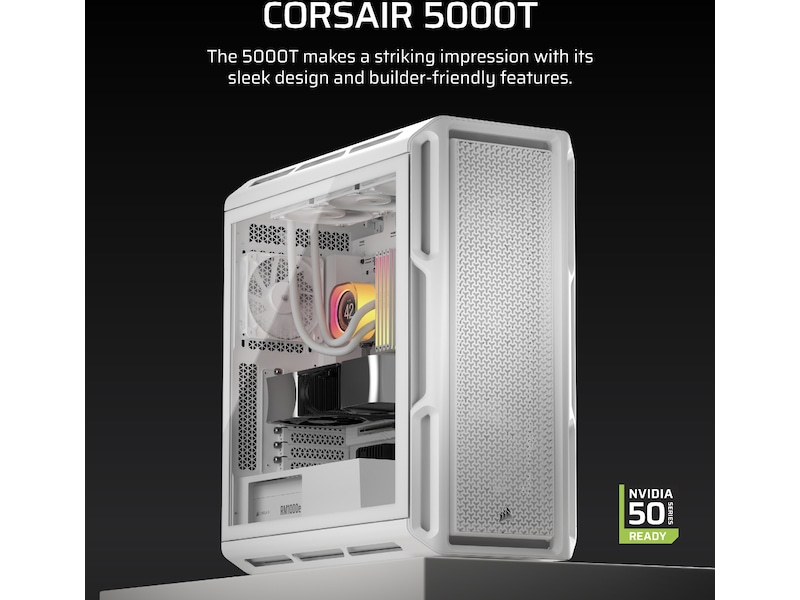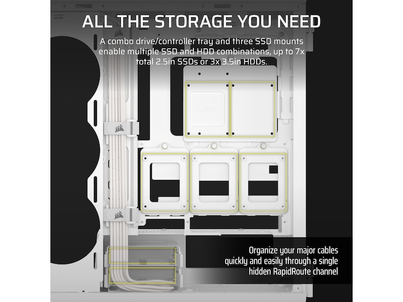 Byggmestervennlige funksjoner, inkludert CORSAIR RapidRoute-kabeladministrasjonssystemet, strømlinjeformer bygget ved å la deg rute kabler gjennom én enkelt skjult kanal. Ytterligere fordeler som vertikal monteringsstøtte, verktøyfrie hengslede sidepaneler og rikelig med oppbevaringsmuligheter forbedrer byggeopplevelsen. Med to kombinasjonsdiskbrett og tre SSD-fester tilbyr 5000T alt du trenger for å lage en fantastisk, høyytelses PC.