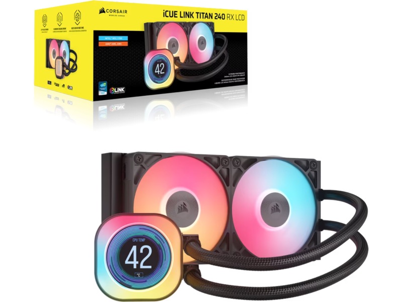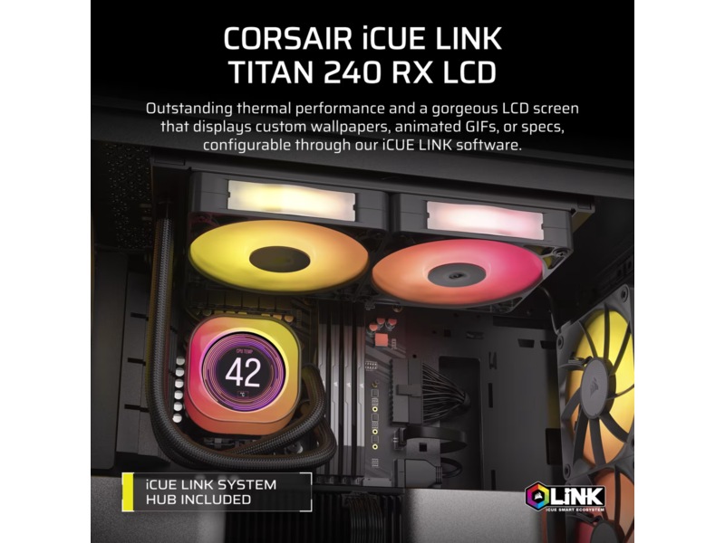 CORSAIR iCUE LINK TITAN RX LCD leverer høy ytelse, ekstremt stillegående kjøling med optimalisert termisk ytelse, strømlinjeformet iCUE LINK-tilkobling og dynamisk RGB-belysning.