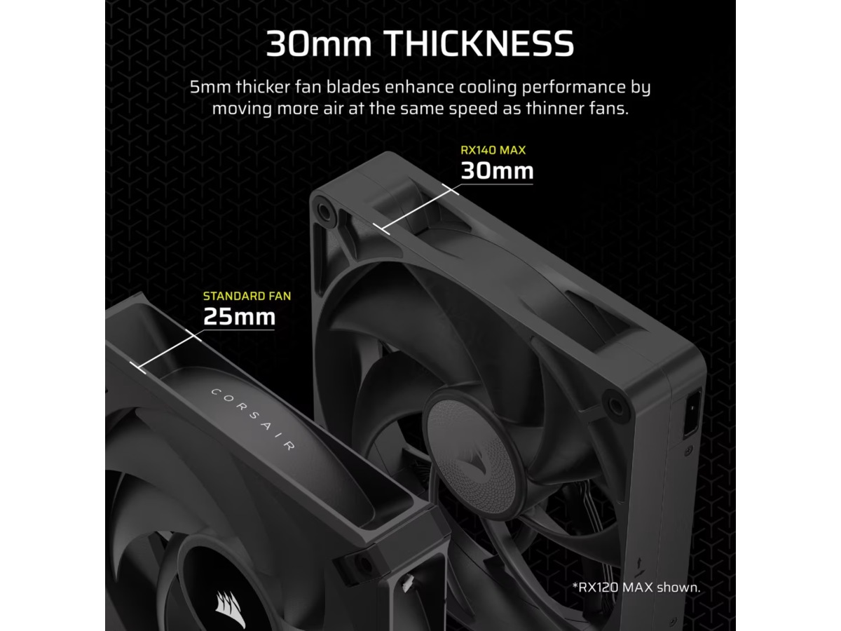 5 mm tykkere vifteblader forbedrer kjøleytelsen ved å flytte mer luft i samme hastighet som tynnere vifter. RX MAX-vifter kan også kjøre mer stillegående, siden de kan rotere saktere for å produsere den samme luftstrømmen.