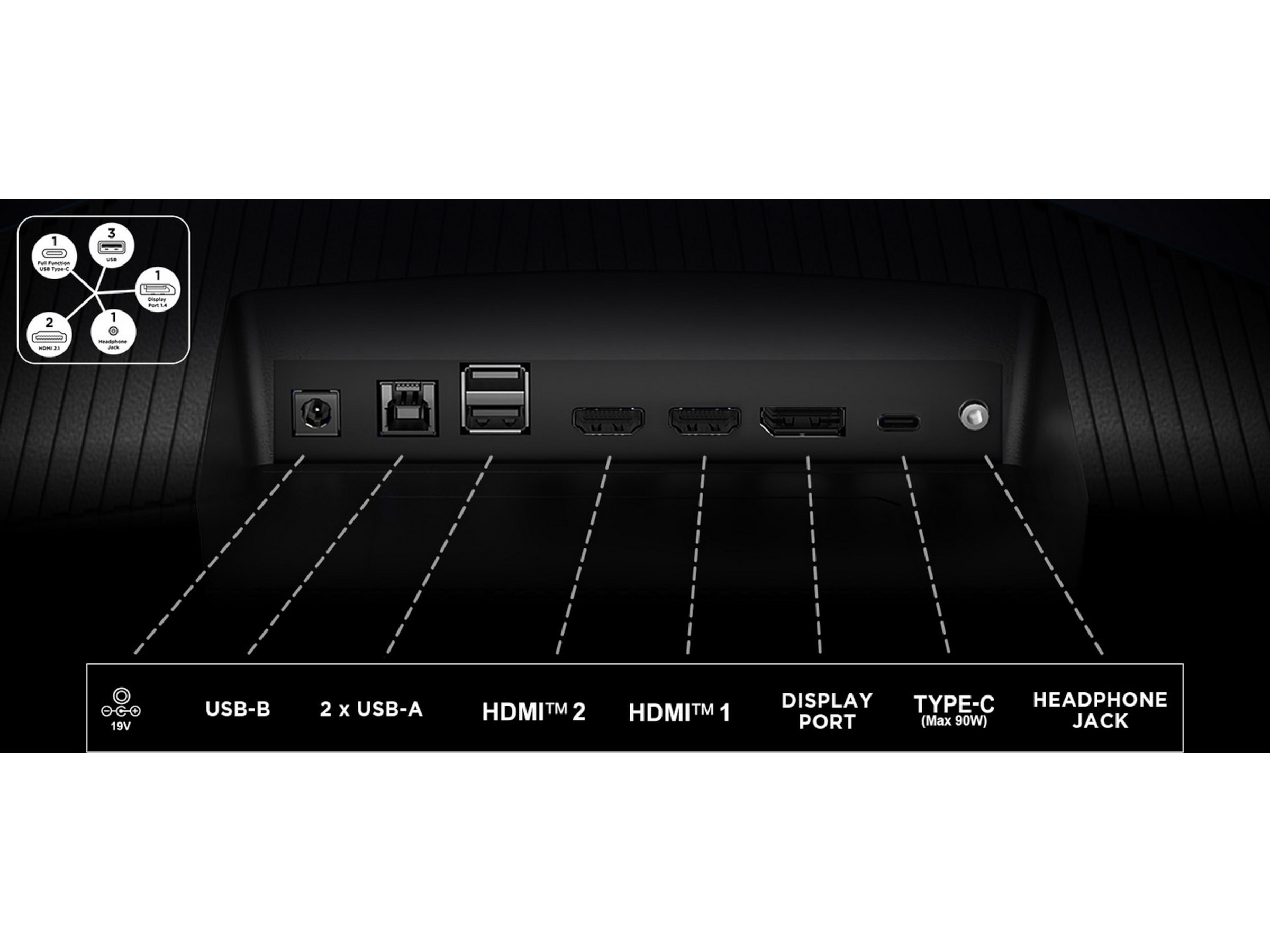 DisplayPort 1.4, USB-C/DisplayPort 1,4 Alt Mode med Power Delivery (strøm inntil 90 W), USB 3.0 (Type B), Hodetelefoner, 2 x USB 3.0 (Type A), 2 x HDMI