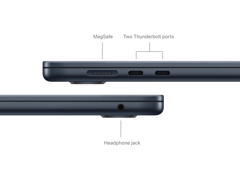 - FULLKONTAKT – MacBook Air har to Thunderbolt-porter, en hodetelefonutgang, wifi 6E,(4) Bluetooth 5.3 og en MagSafe-ladeport. Koble til opptil to eksterne skjermer med maskinen lukket.