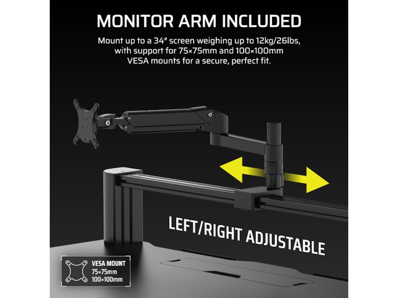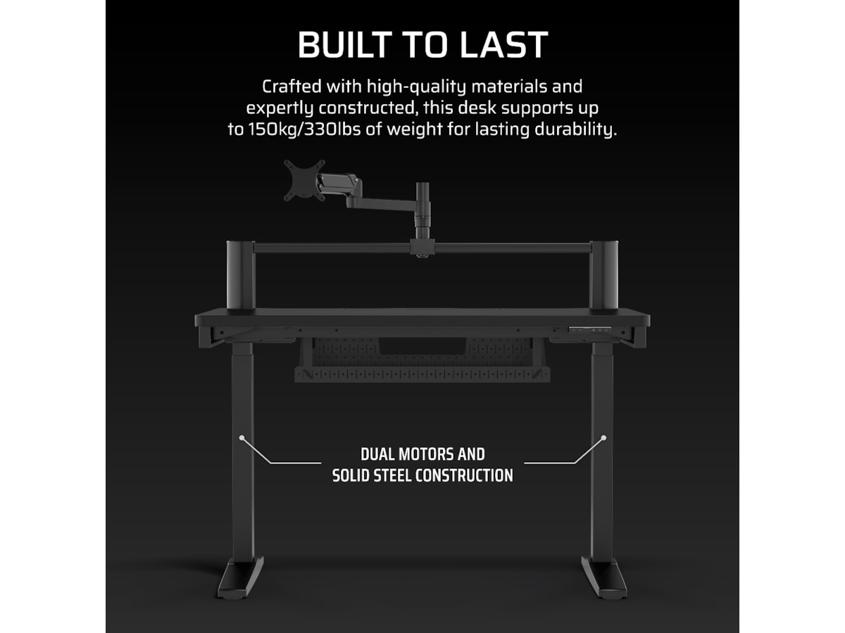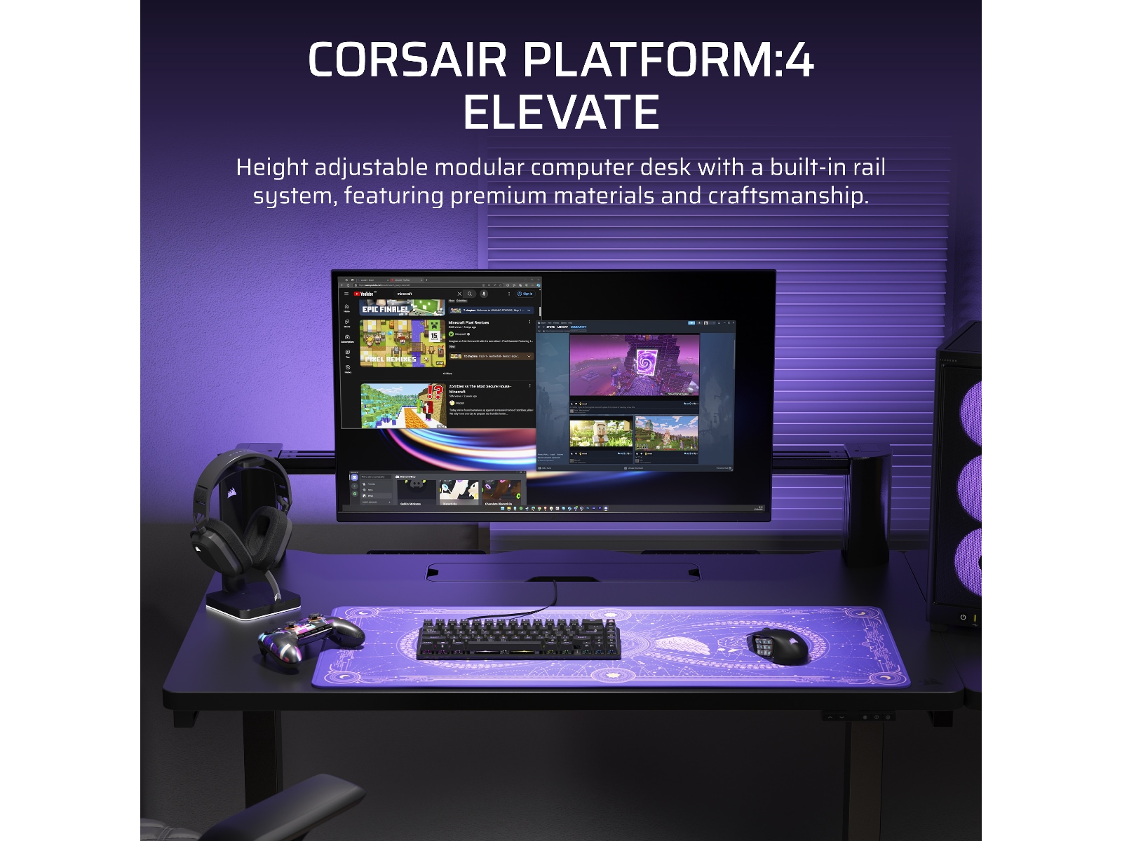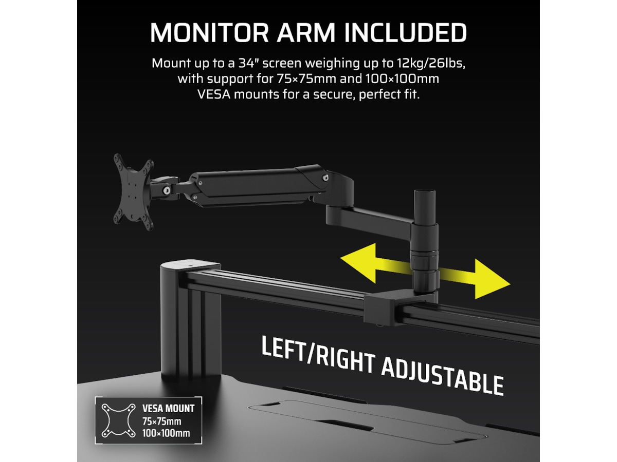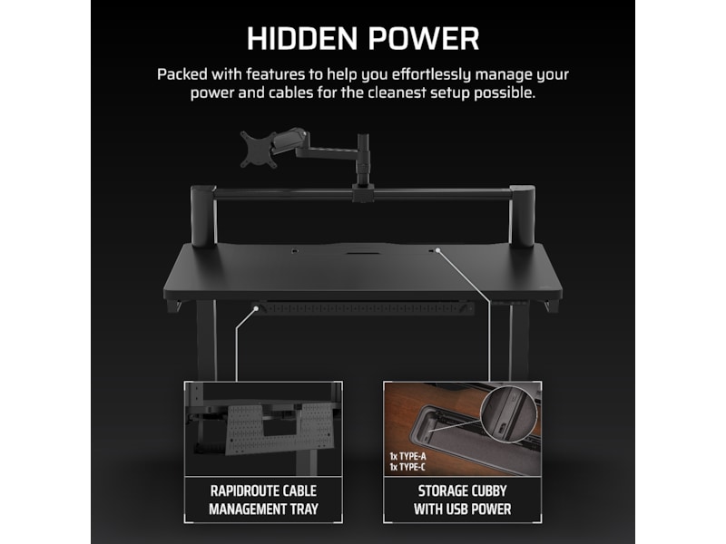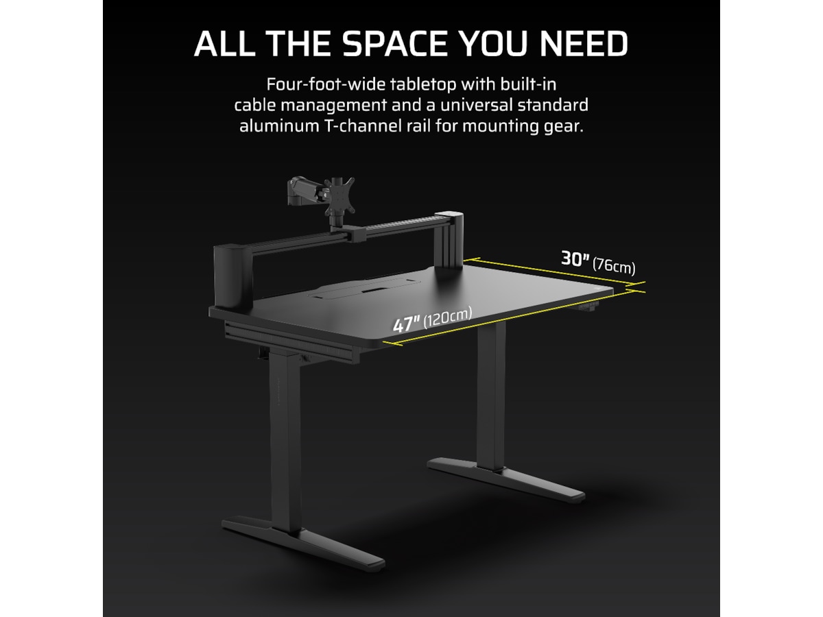 Transformer arbeidsområdet ditt med den høydejusterbare CORSAIR Platform:4 Elevate Desk, som har en 4-fots bred bordplate, inkludert skjermarm, innebygd USB-strøm og et modulært T-skinne-system.