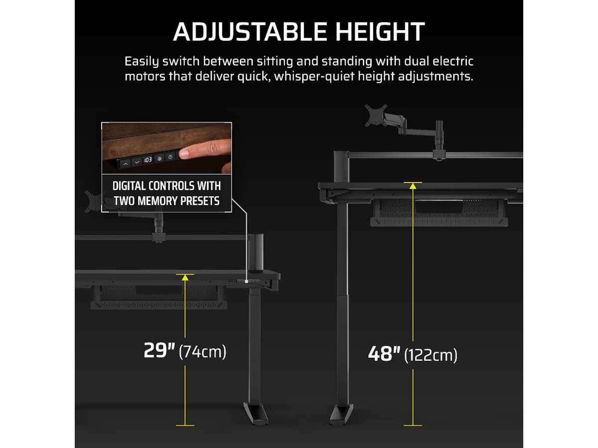 Still deg inn på ønsket høyde med enkel knappetrykking, fra 74 til 122 cm, ved hjelp av den integrerte høydekontrolleren med LED-skjerm og to minneinnstillinger.