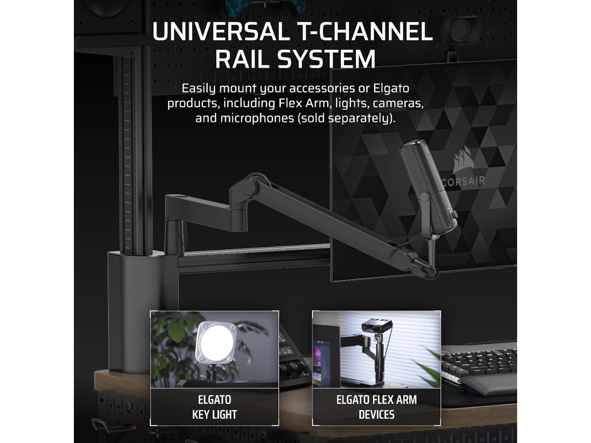 CORSAIR og Elgato vet nøyaktig hva innholdsskapere trenger for å gjøre det de er best på. De medfølgende adapterne for Elgato Multi Mount og Flex Arm lar deg montere kameraer, mikrofoner og lys nesten hvor som helst.