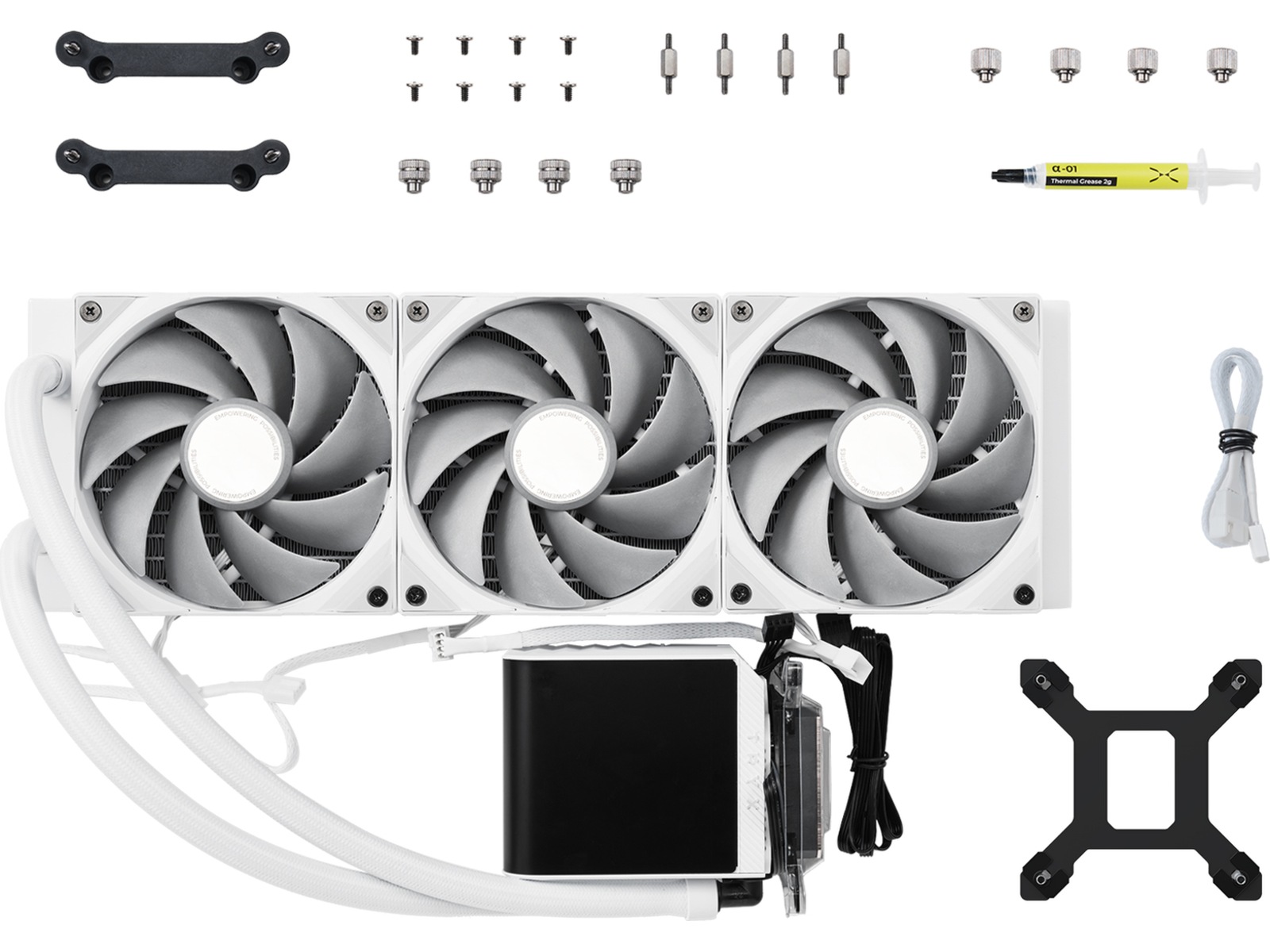 2k@60Hz oppdateringsfrekvens skjerm, 8.-generasjons Asetek-pumpe, Trefasemotor, L-formet 6,5" LED-skjerm, Hylsede rør (400 mm), Anamorf 3D-skjerm, Motherboard VRM Cooling Fan, A-01 høykvalitets termisk fett, Vifteblader av flytende krystallpolymer (LCP)