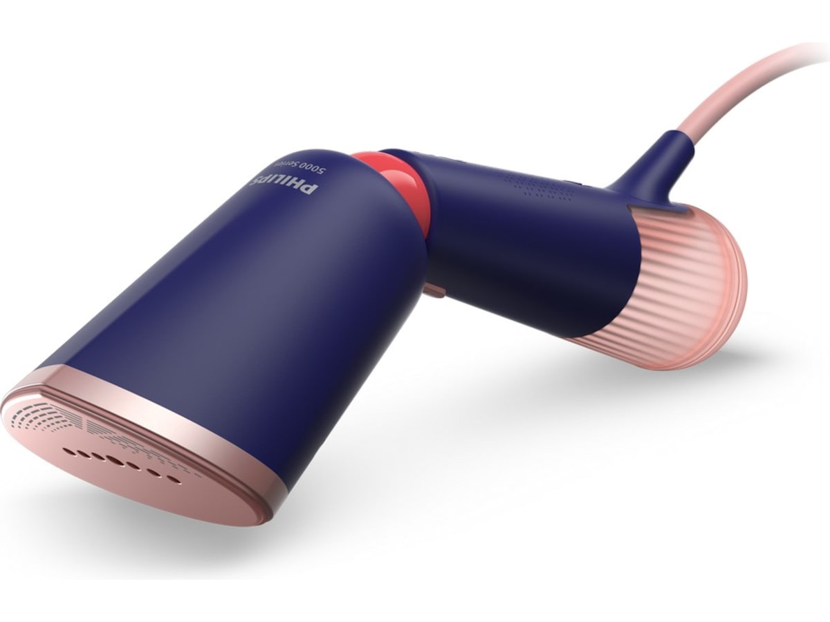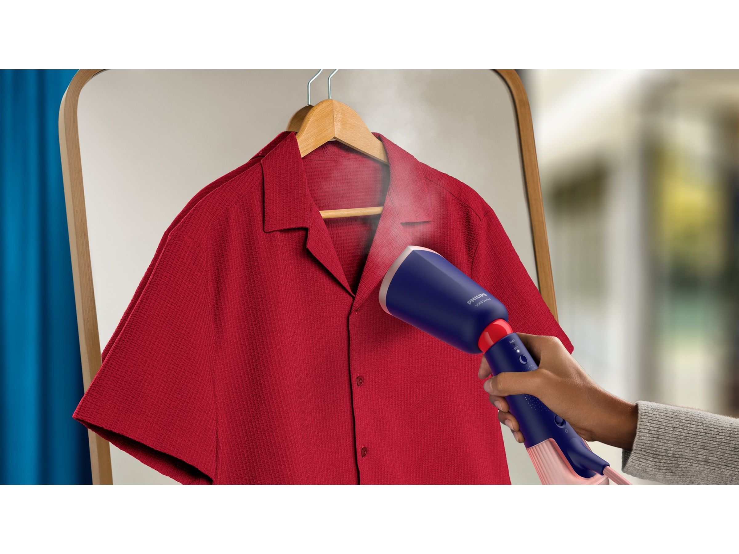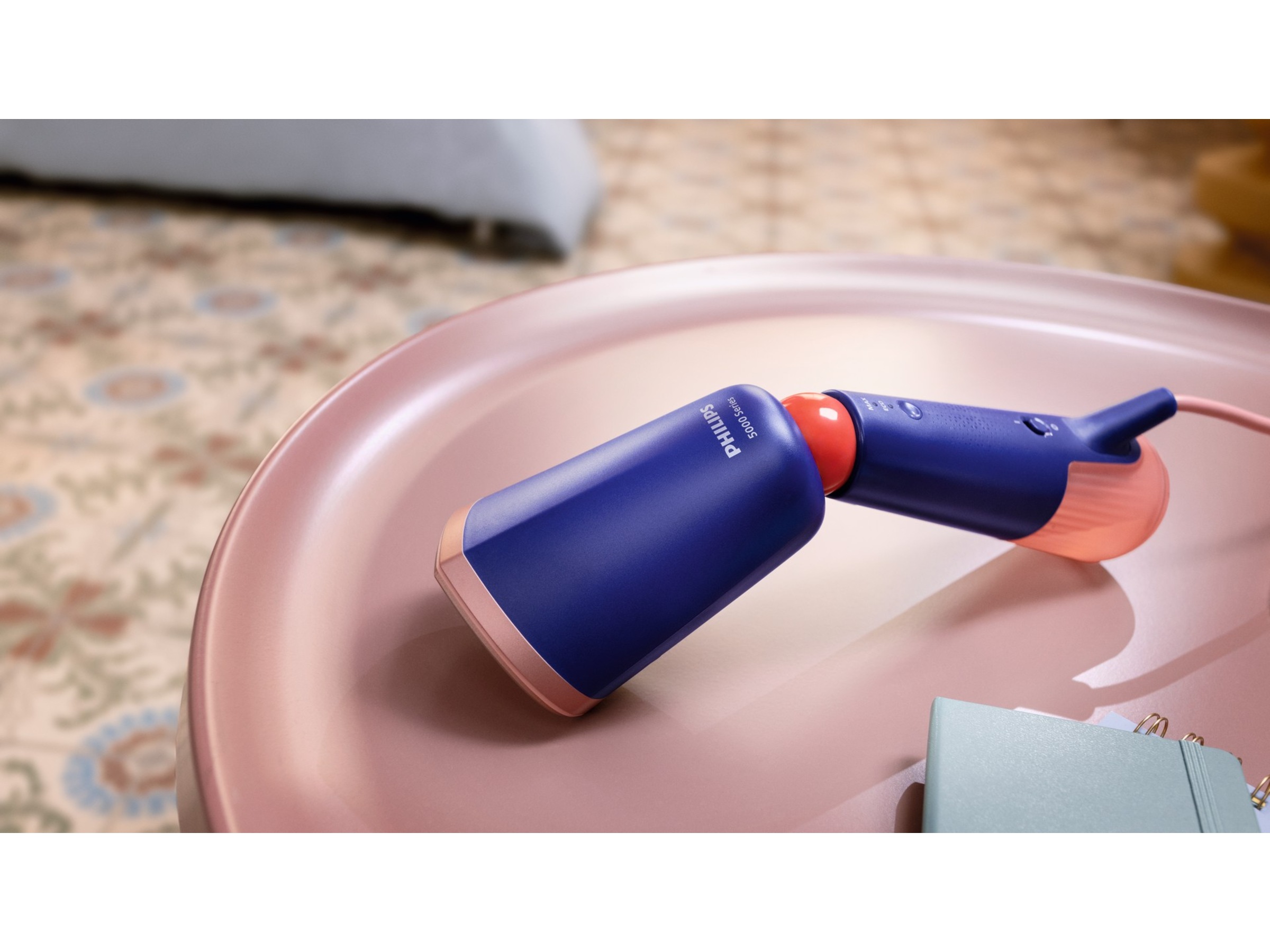 Philips håndholdte steamer 5000 Series er klar når du er det. Bare still inn damphodet for å steame plagg på en kleshenger eller en flat overflate, og steam i vei. Den justerbare vippefunksjonen gjør det enkelt å pakke den med seg på reise og å oppbevare den hjemme.