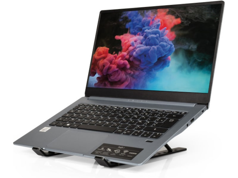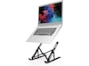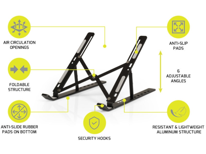 Dette produktet er et ergonomisk sammenleggbart notebookstativ, kompatibelt med 10 "til 15,6" bærbare datamaskiner. Sikkerhetskroker og sklisikre puter forhindrer enheten i å falle av stativet.