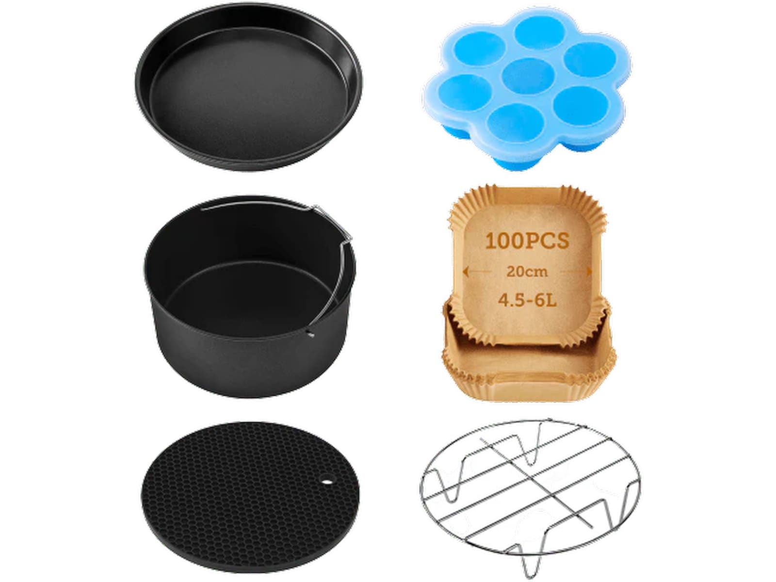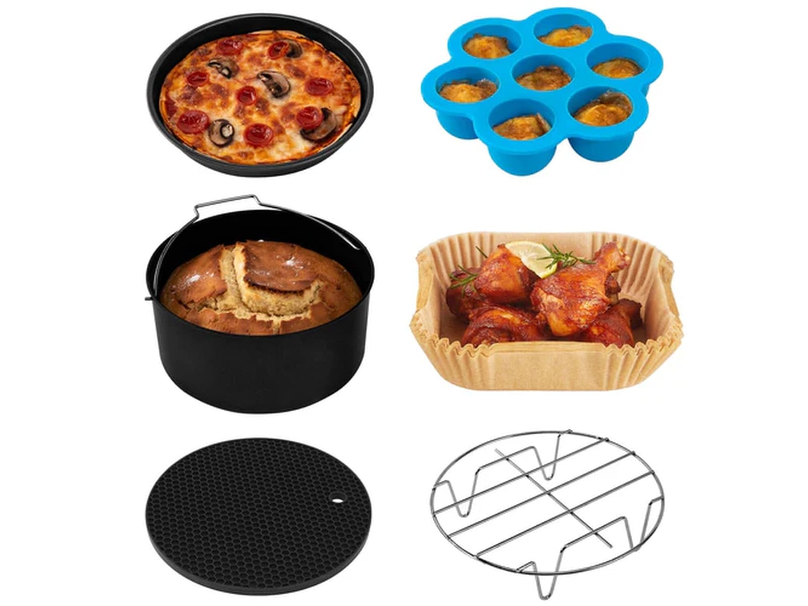 Gjør din Cosori Airfryer enda mer allsidig med Air Fryer tilbehørsettet. Med en kakepanne, pizzapanne, silikonmatte, metallholder, eggbiterform og en stativ med 4 grillspyd, vil du kunne lage hvilken som helst oppskrift du bestemmer deg for.