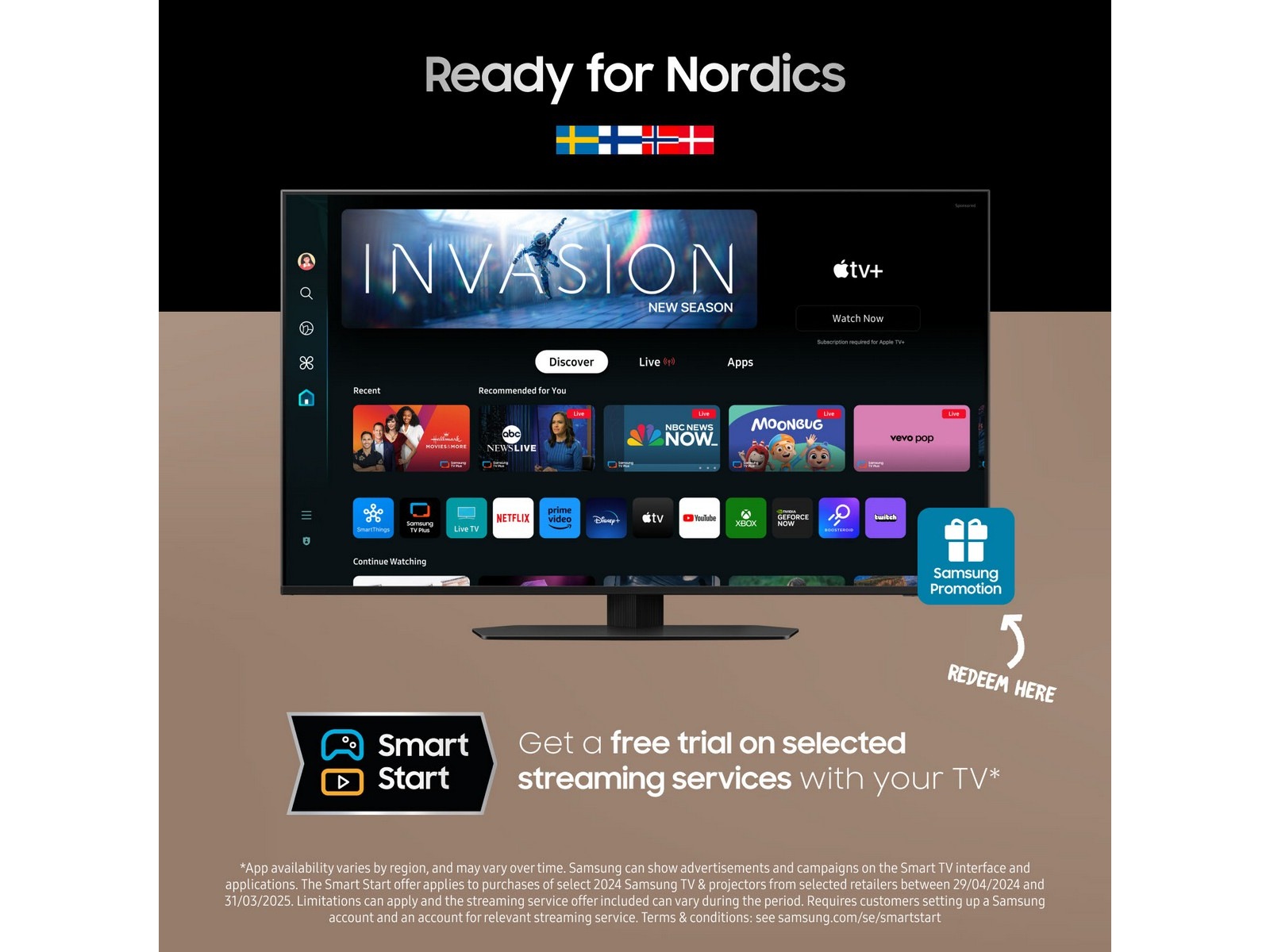 *Gjelder ved kjøp av utvalgte Samsung TV-er fra 2024 og utvalgte projektormodeller på samsung.com og hos utvalgte forhandlere i perioden 29.04.2024–31.03.2025. Underlagt begrensninger, og strømmetjenestetilbudene som inngår, kan variere i løpet av kampanjen. Krever Samsung-konto og at kunden oppretter konto hos den aktuelle strømmetjenesten. Vilkår: samsung.com/no/smartstart