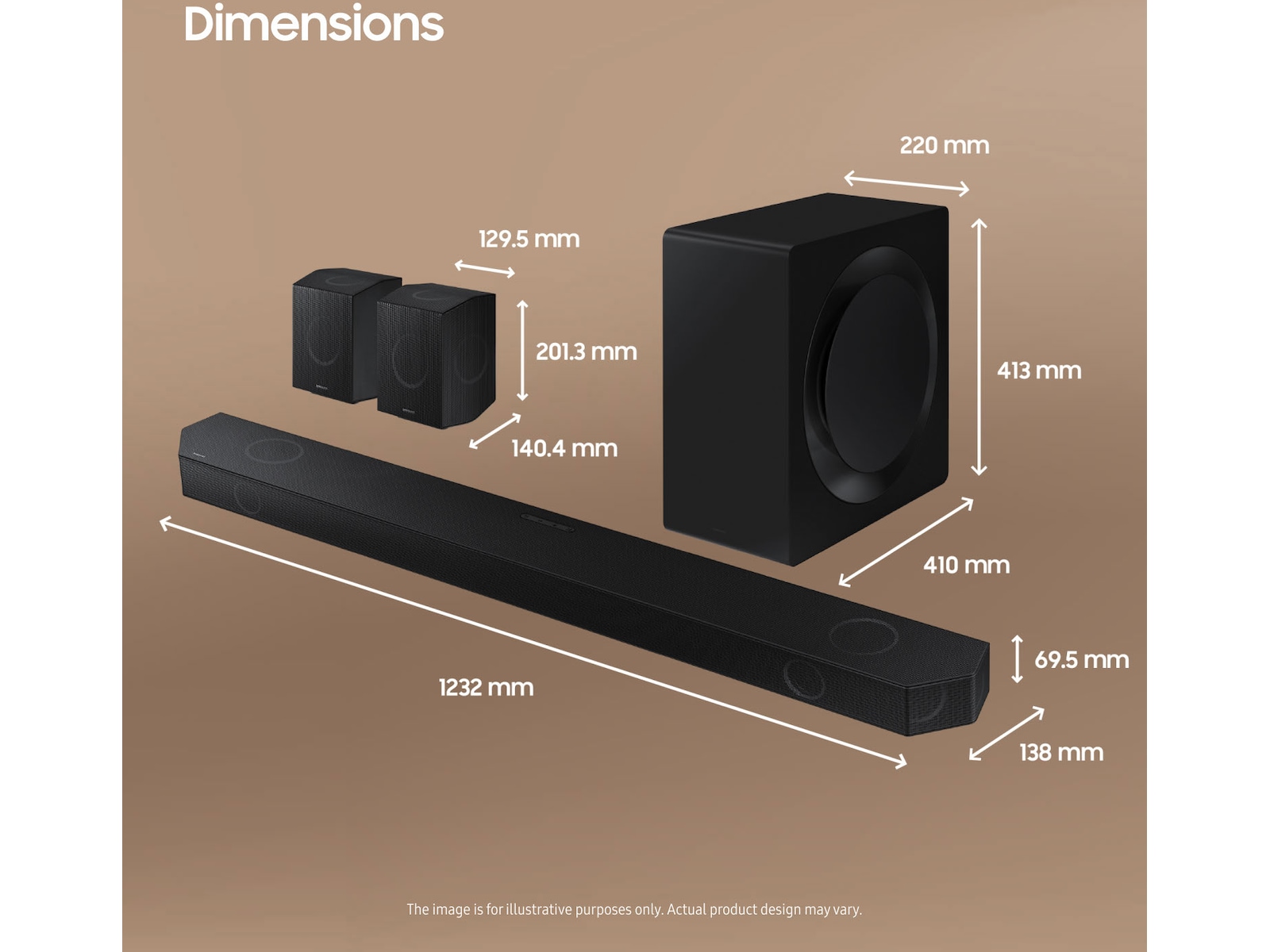 Bakkanalshøyttaler: 12.95 cm x 14.04 cm x 20.13 cm / 3.4 kg, Subwoofer: 22 cm x 41 cm x 41.3 cm / 11.7 kg, Lydbjelke: 123.2 cm x 13.8 cm x 6.95 cm / 7.7 kg