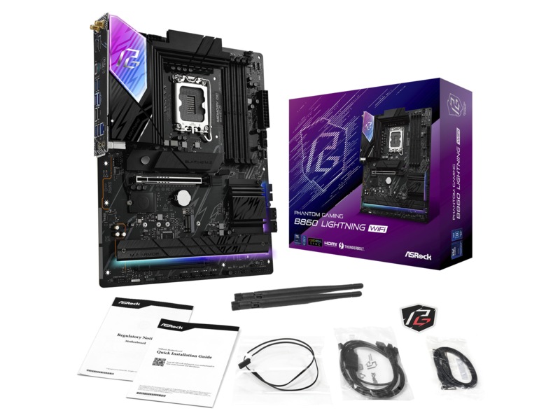 Inkludert tilbehør 2 x ASRock WiFi 2.4/5/6 GHz Antennas, Termistorkabel, 1 til 3 ARGB LED-splitterkabel