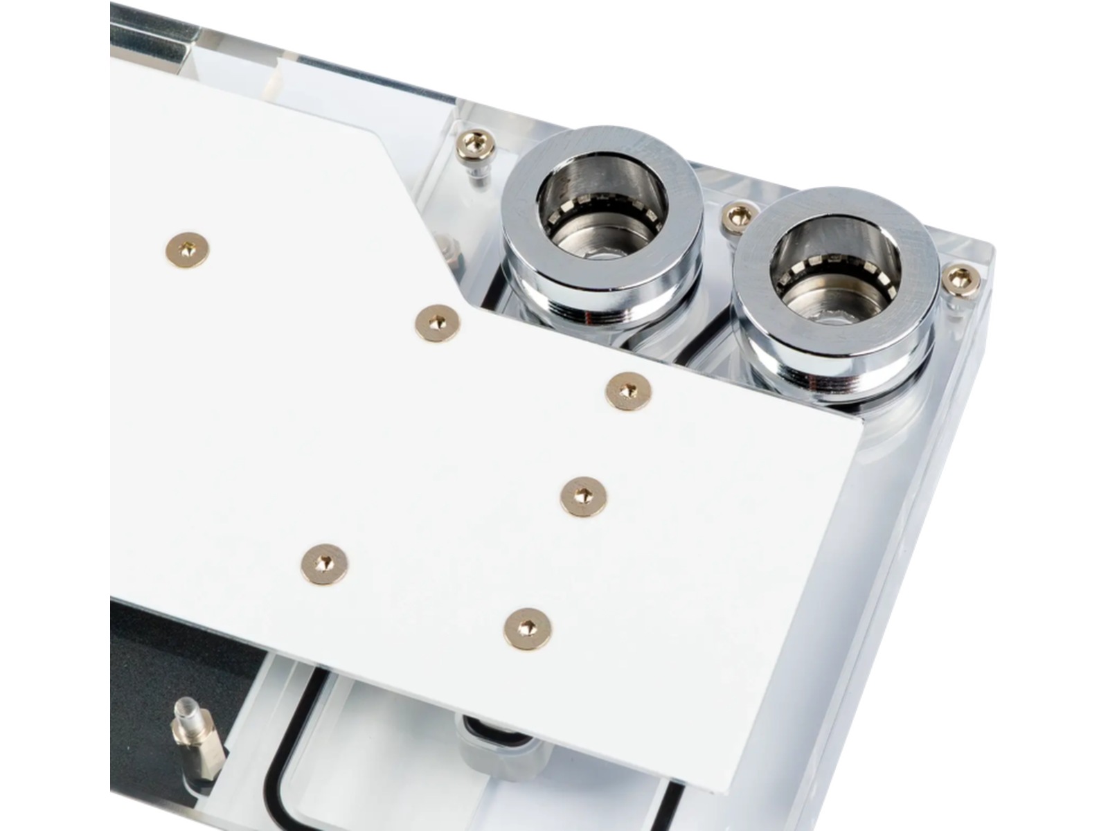 Glacier G40 ASUS GPU Block introduserer også noen nye funksjoner, for eksempel en ny tilkoblingsplassering som tillater bedre rørføring, selv i mer kompakte chassis. For å forbedre stabiliteten er det lagt til en GPU-støttebrakett for å koble vannblokken til den bakre PCI-braketten, slik at GPU-en monteres tryggere.