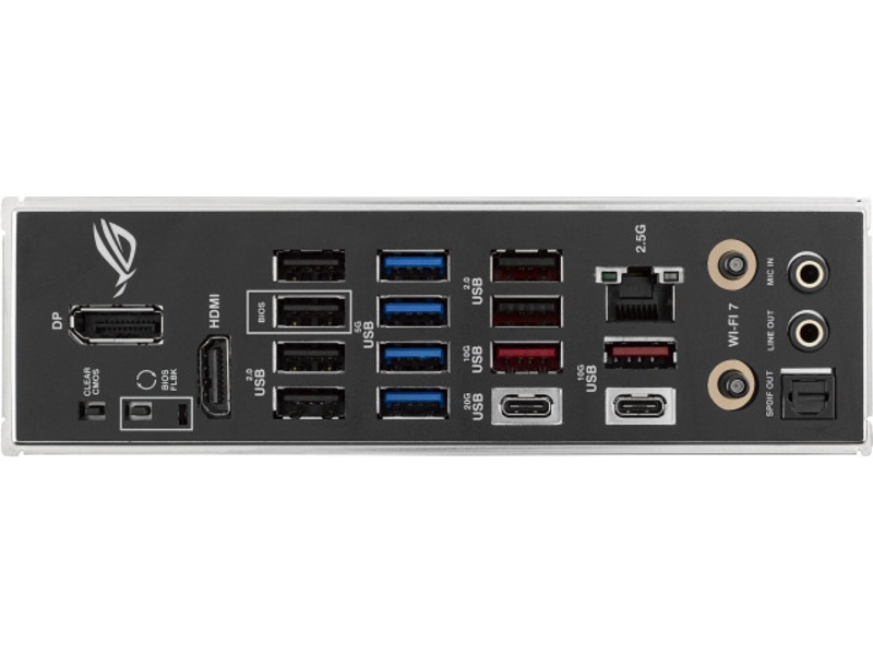 Grensesnitt 1 x lydutlinje - minijakk, 1 x USB-C 3.2 Gen2x2, 1 x LAN (2.5Gigabit Ethernet), 2 x USB 3.2 Gen 2, 1 x mikrofon - minijakk, 2 x antenne, 4 x USB 3.2 Gen 1, 1 x DisplayPort, 6 x USB 2.0, 1 x HDMI, 1 x USB-C 3.2 Gen 2, 1 x SPDIF-utgang