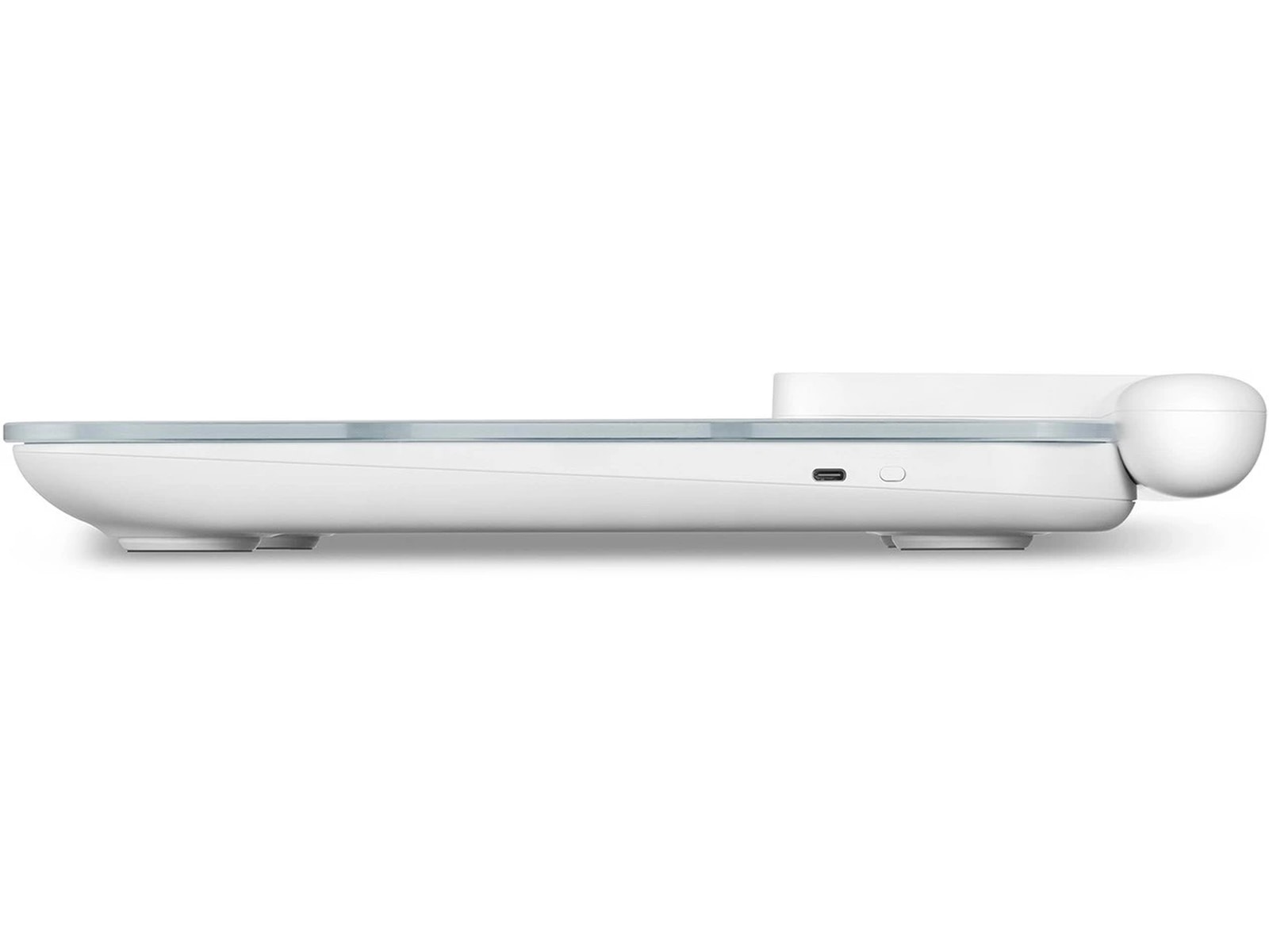 PureSense-vekten har en fargerik LCD-skjerm og funksjoner som automatisk aktivering og utkobling. Den kompakte størrelsen og det moderne designet gjør den enkel å bruke og oppbevare. Vekten lades med en USB-C-kabel og har en imponerende standby-tid på opptil 8 måneder på én lading.