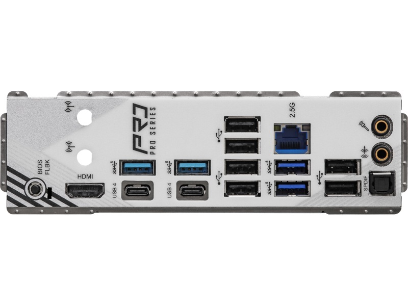 4 x USB 3.2 Gen 1, 1 x SPDIF-utgang, 1 x HDMI, 1 x LAN (2.5Gigabit Ethernet), 6 x USB 2.0, 1 x lydutlinje - minijakk, 2 x USB4, 1 x mikrofon - minijakk