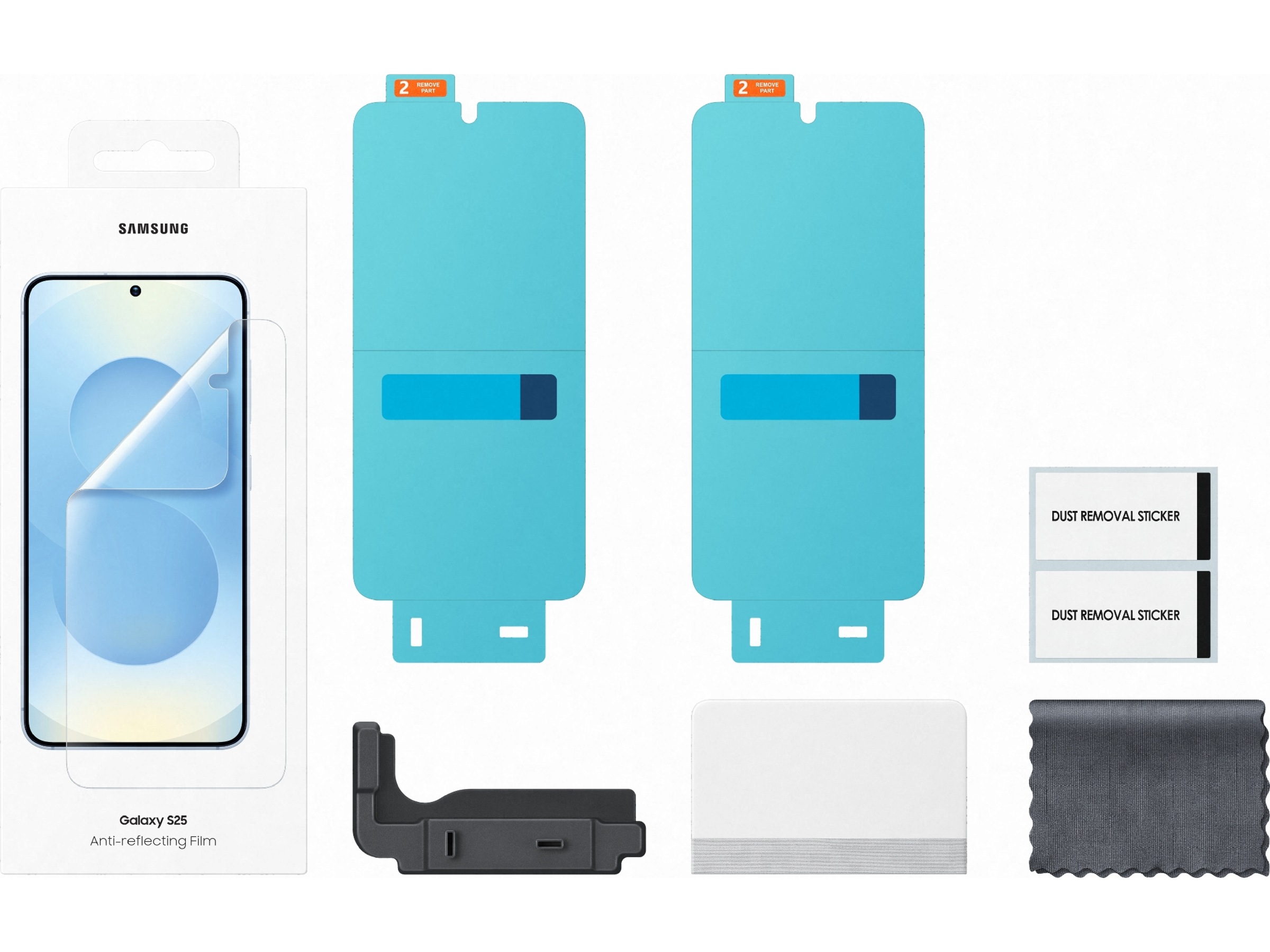 Pakkeinnhold 2 skjermbeskyttere, Renseklut av mikrofiber, Støvfjerningsetikett, Spatel, Applikator