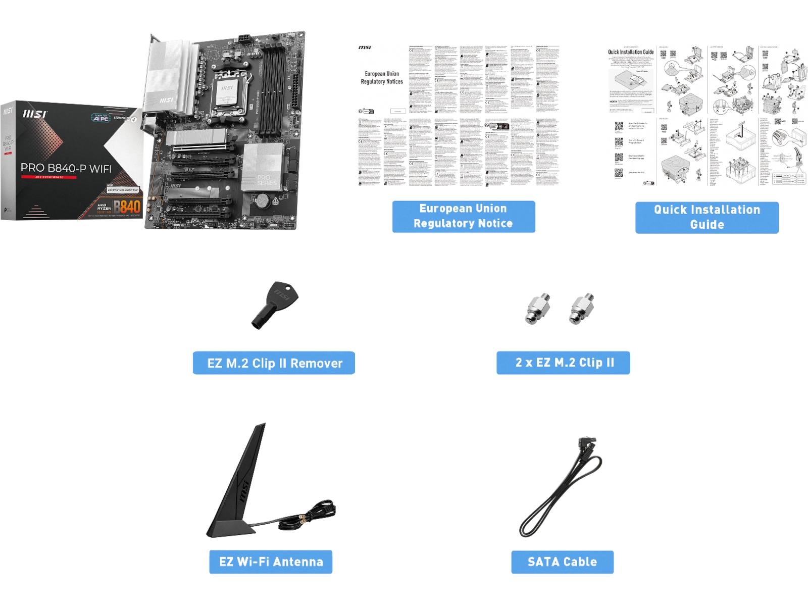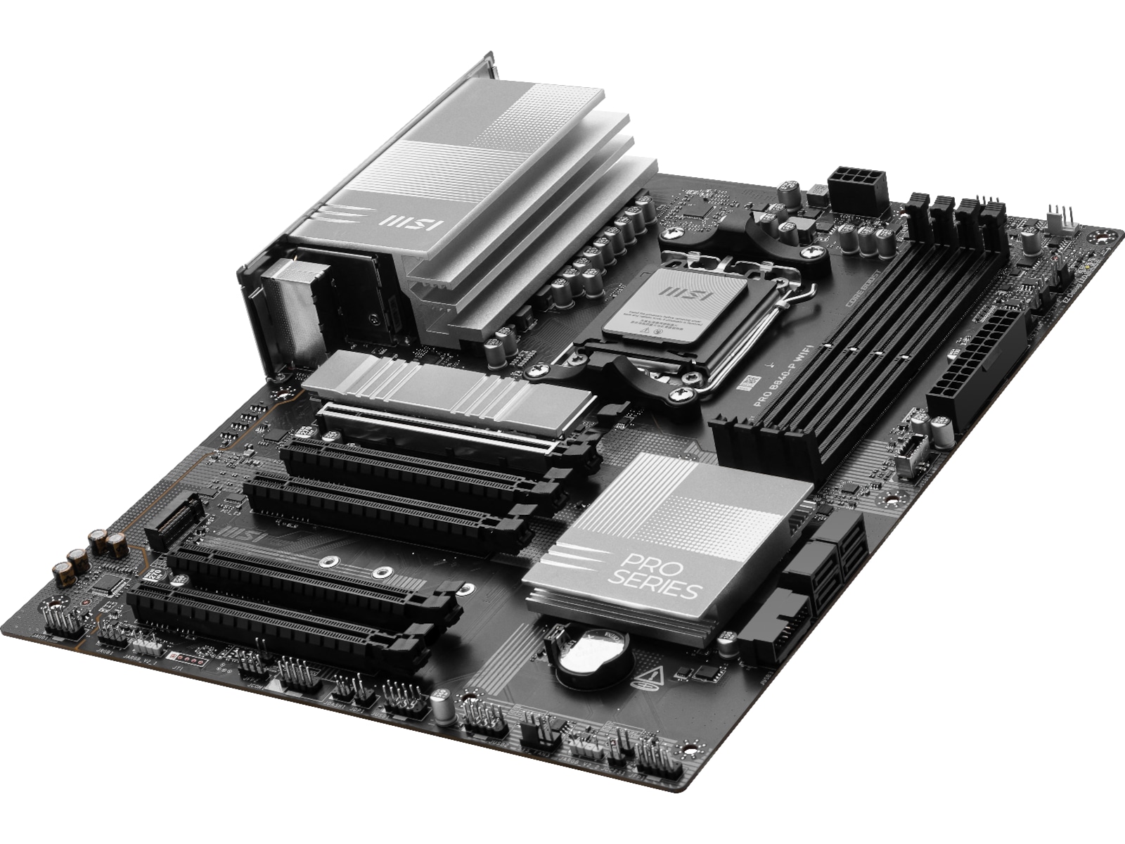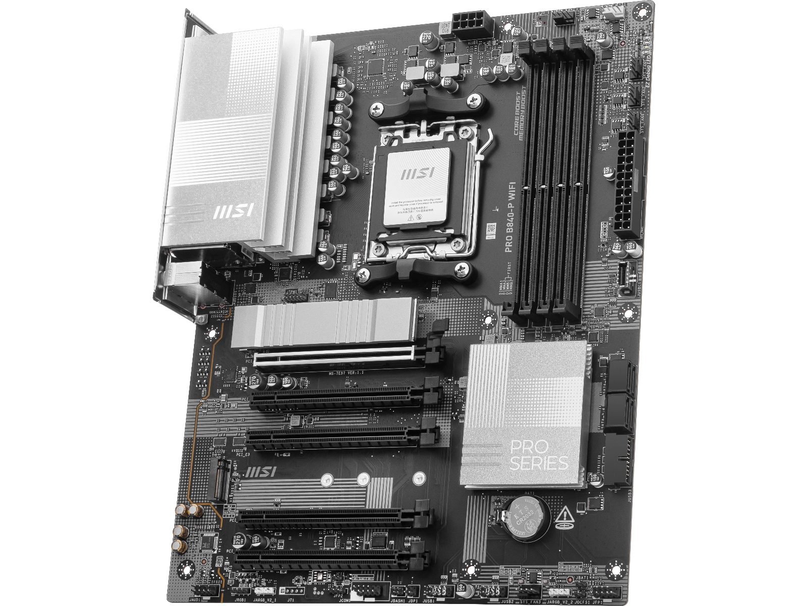 PRO B840-P WIFI tilbyr et enkelt design med en harmonisk sølvfarge som perfekt matcher både hvite og svarte PC-bygninger. Den er konstruert med mange eksklusive funksjoner fra MSI, en ekte Wi-Fi 7 med EZ Antenna, 2.5G LAN, og PCIe 4.0 M.2 med EZ M.2 Shield Frozr II, klar for AMD Ryzen 9000-serieprosessorer.