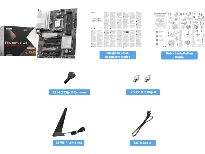 PRO B840-P WIFI tilbyr et enkelt design med en harmonisk sølvfarge som perfekt matcher både hvite og svarte PC-bygninger. Den er konstruert med mange eksklusive funksjoner fra MSI, en ekte Wi-Fi 7 med EZ Antenna, 2.5G LAN, og PCIe 4.0 M.2 med EZ M.2 Shield Frozr II, klar for AMD Ryzen 9000-serieprosessorer.