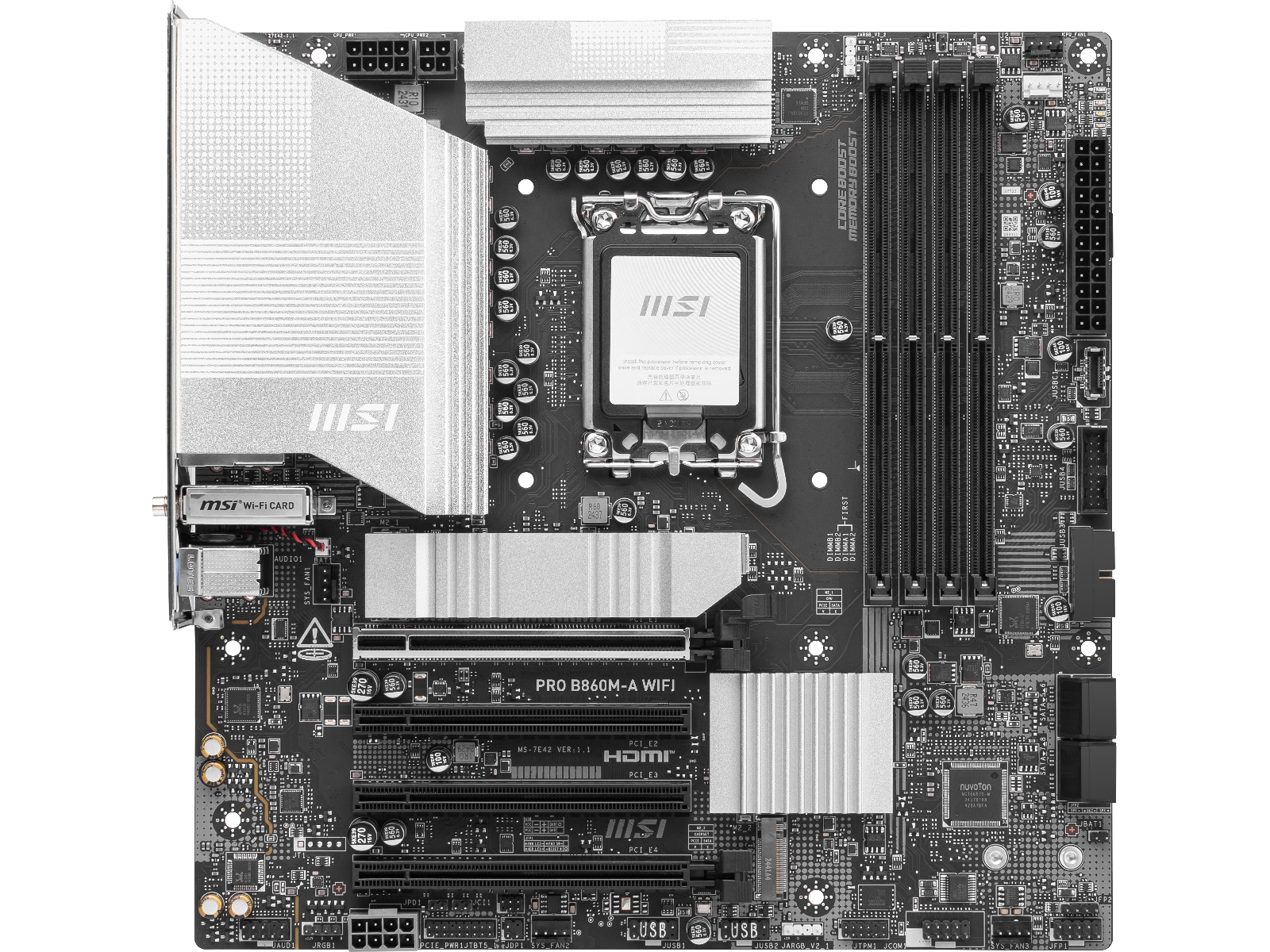 PRO B860M-A WIFI tilbyr et enkelt design med et harmonisk sølvfargeskjema som passer perfekt både hvite og svarte PC-bygg. Det er konstruert med mange eksklusive funksjoner fra MSI, et ekte Wi-Fi 7 med EZ Antenne, 5G LAN, Thunderbolt 4, PCIe 5.0 M.2, og Supplerende PCIe-strøm, klar for Intel® Core™ Ultra-prosessorer