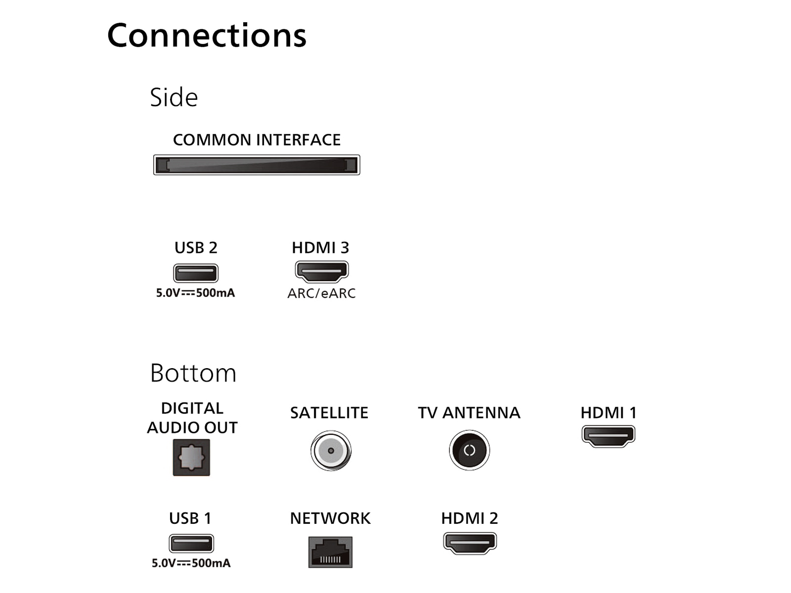 LAN - bunn, HDMI - side, USB - bunn, 2 x HDMI - bunn, USB - side, Digital lydutgang (optisk) - bunn