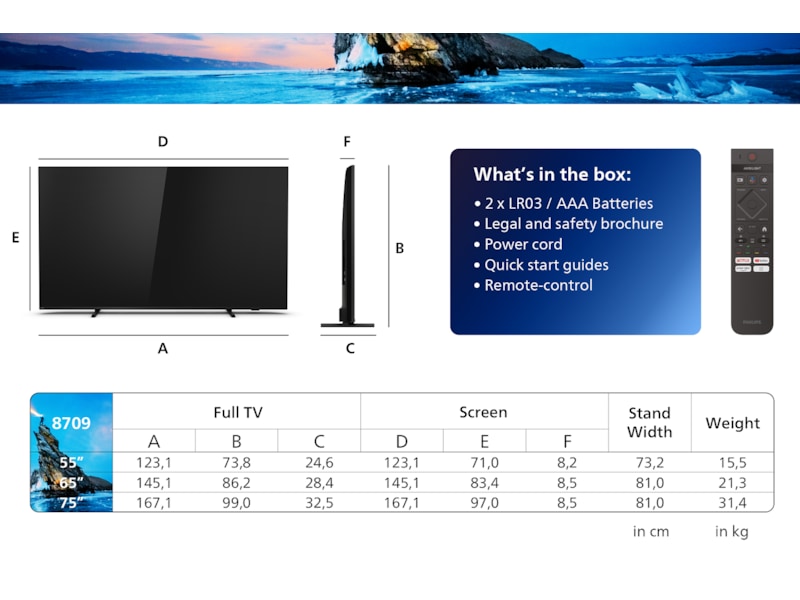 Dimensjoner mellom støtteføttene - 73.5 cm, Panel med stativ - 123.1 cm x 24.6 cm x 73.8 cm x 15.5 kg, Panel uten stativ - 123.1 cm x 8.2 cm x 72 cm x 15.2 kg