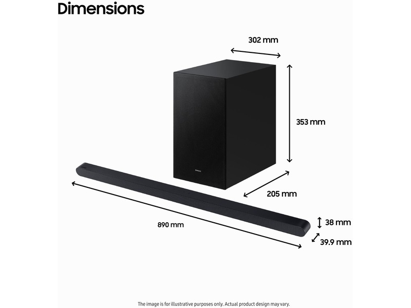 Lydbjelke: 89 cm x 3.99 cm x 3.8 cm / 0.84 kg, Subwoofer: 20.5 cm x 30.2 cm x 35.3 cm / 6 kg