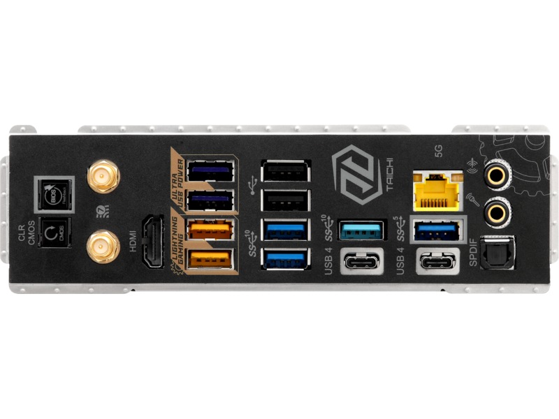 1 x lydutlinje - minijakk, 1 x mikrofon - minijakk, 3 x USB 3.2 Gen 1, 2 x antenne, 1 x HDMI, 2 x USB 2.0, 2 x USB4, 1 x LAN (5Gigabit Ethernet), 1 x SPDIF-utgang, 5 x USB 3.2 Gen 2